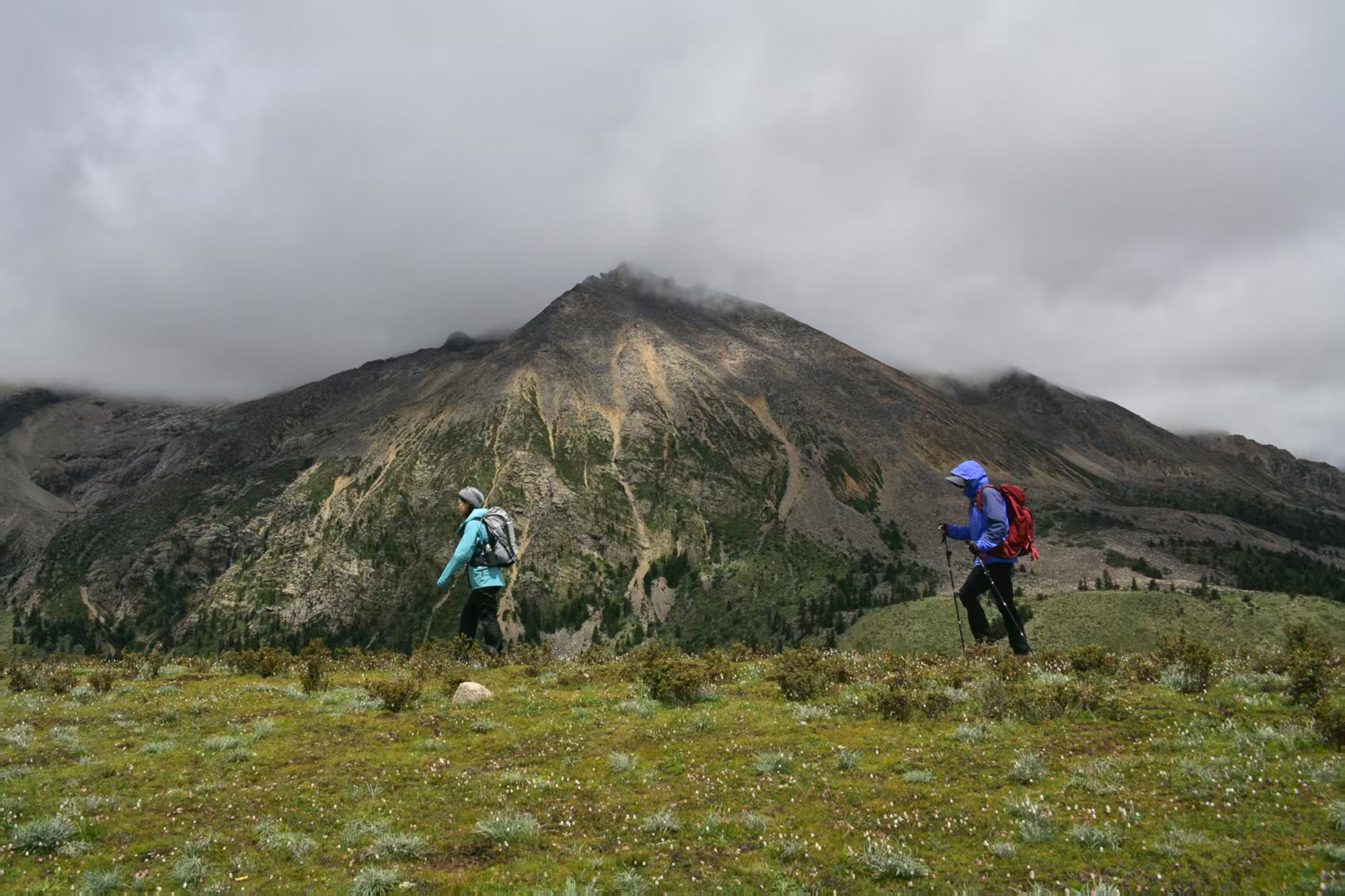 再往前走,我们便来到了一片开阔的草甸。随着密林成功穿越,眼前的视野变得逐渐开阔起来。我告诉队员,我们要往面前的山脊上斜切,山脊线上的风光更好。