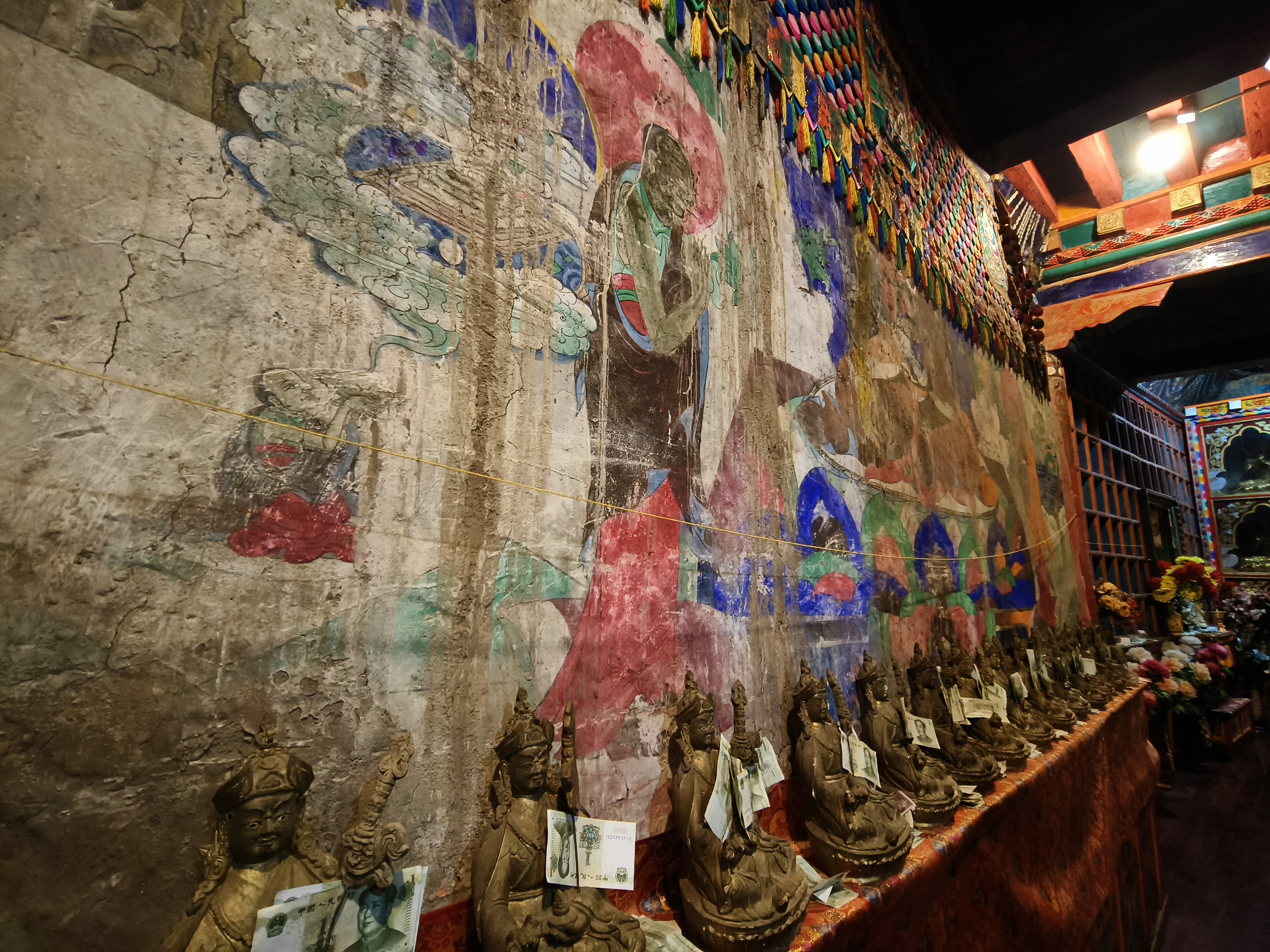 在室外摄影耗费不少时辰,为了赶去德格印经院,只来得及在寺里最古老的大殿转了转。和领队一起脱鞋踩进殿内,上到二楼走廊,墙上的物件很是惹眼:一排硕大的面具垂着,旁边竟还挂着很多旧时牧民用的猎枪,宗教器物与生活旧物挨在一处,倒有种特别的张力。往里走至莲花生大师的佛像室内,绕到背面时忽然撞见惊喜——800多年前的壁画还残存着几片,虽不完整,那线条和色彩里的精美却半点没被岁月磨掉,轻轻看过去,像触到了一段沉甸甸的过往。