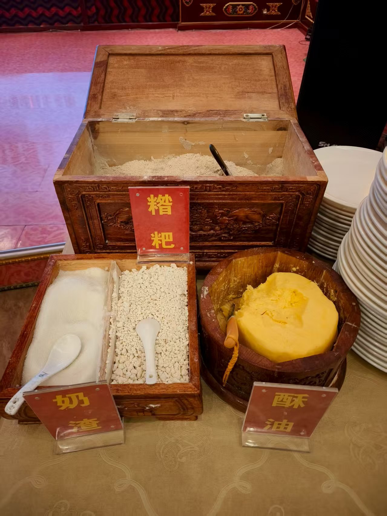 雀儿山宾馆原是县政府招待所,今早的早餐称得上丰盛。除了常见的普通早点,还摆着藏式特色的酥油茶、糌粑、奶渣和酥油,能尝到这样地道的藏式吃食倒是意外的惊喜。