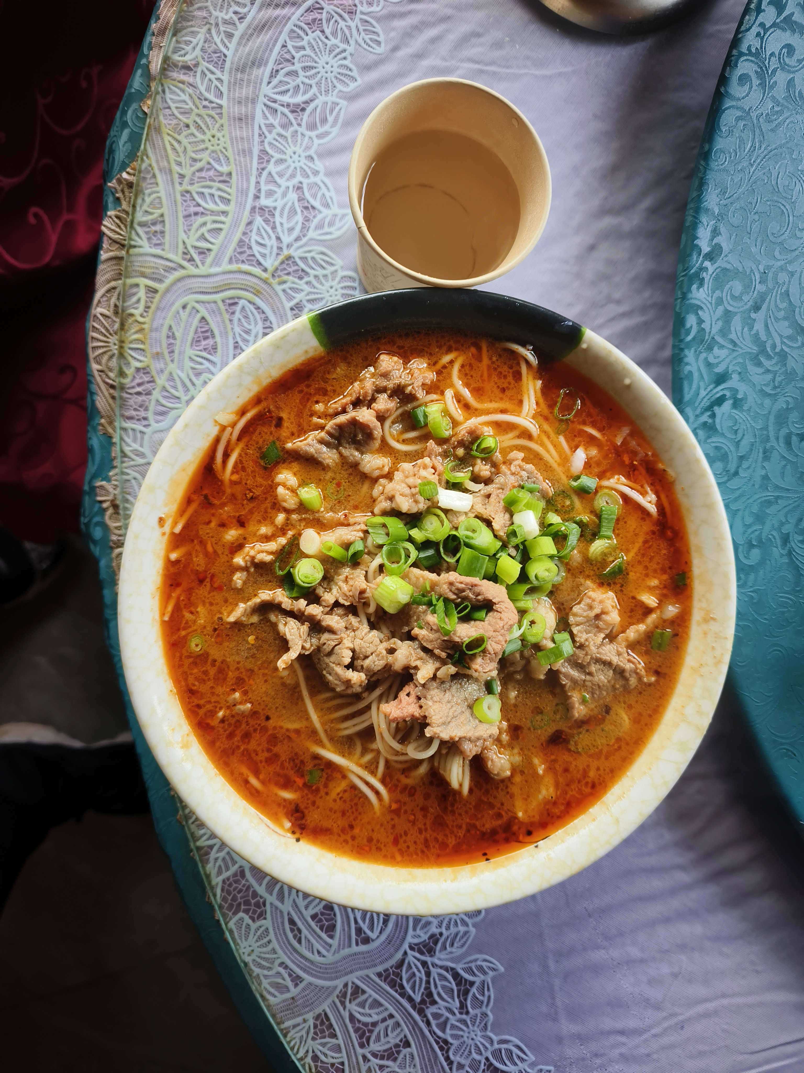 领队熟门熟路地领着我们进了家“好又来饭店”,点了25元一碗的牛肉面。结果面一上桌才发现,哪该叫牛肉面啊,叫“肉铺面”才贴切!这面味道够地道,肉的分量更实在,堆得满满当当,我们几个人使劲吃,最后都没吃完,实在是太实惠了。