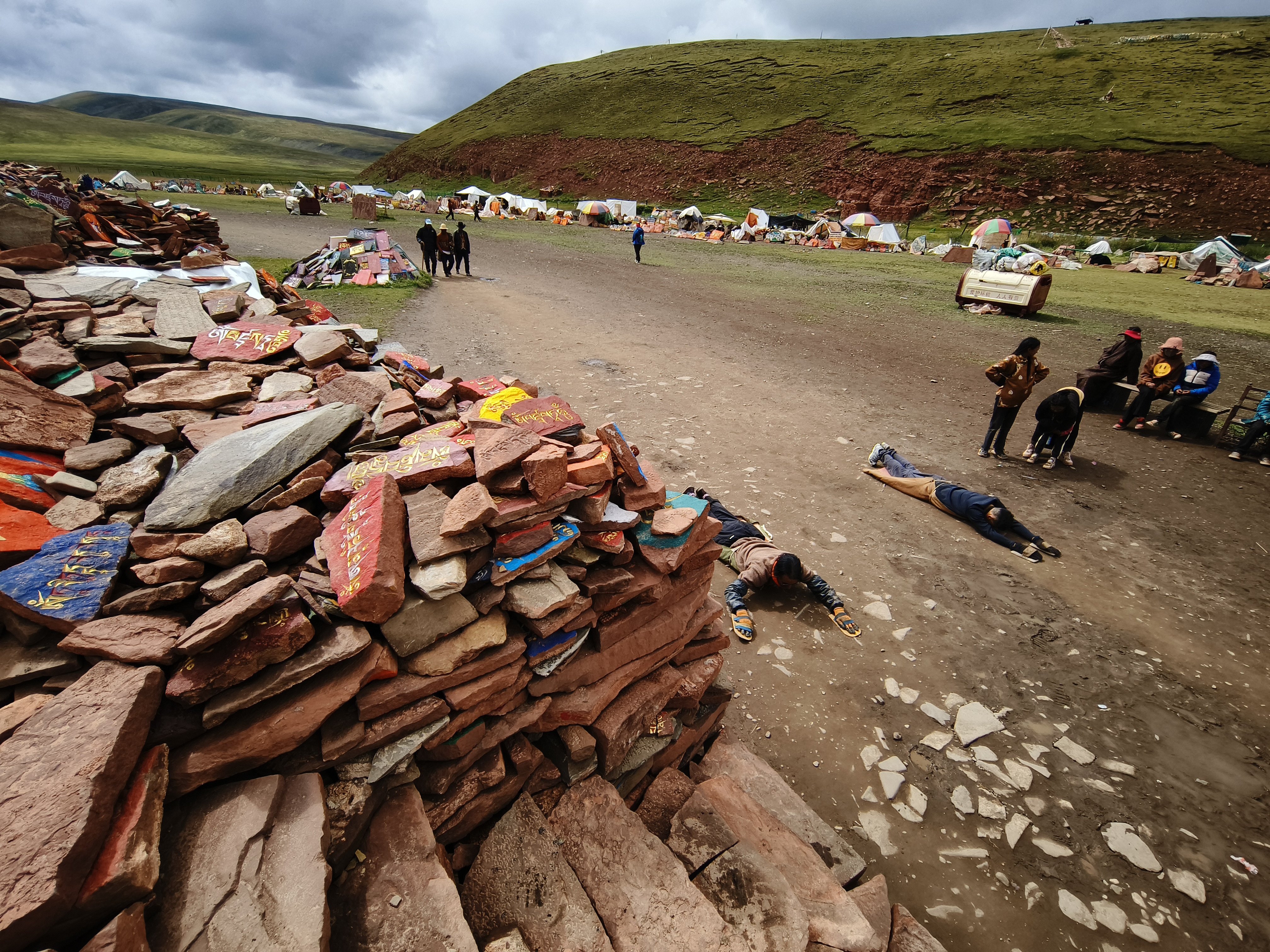 玛尼城旁挺热闹,不少藏民正低头雕刻着刻有六字真言的经石。还有些小孩会凑过来,要么索要一元钱就说帮着转城,要么就热情地推荐经石。
