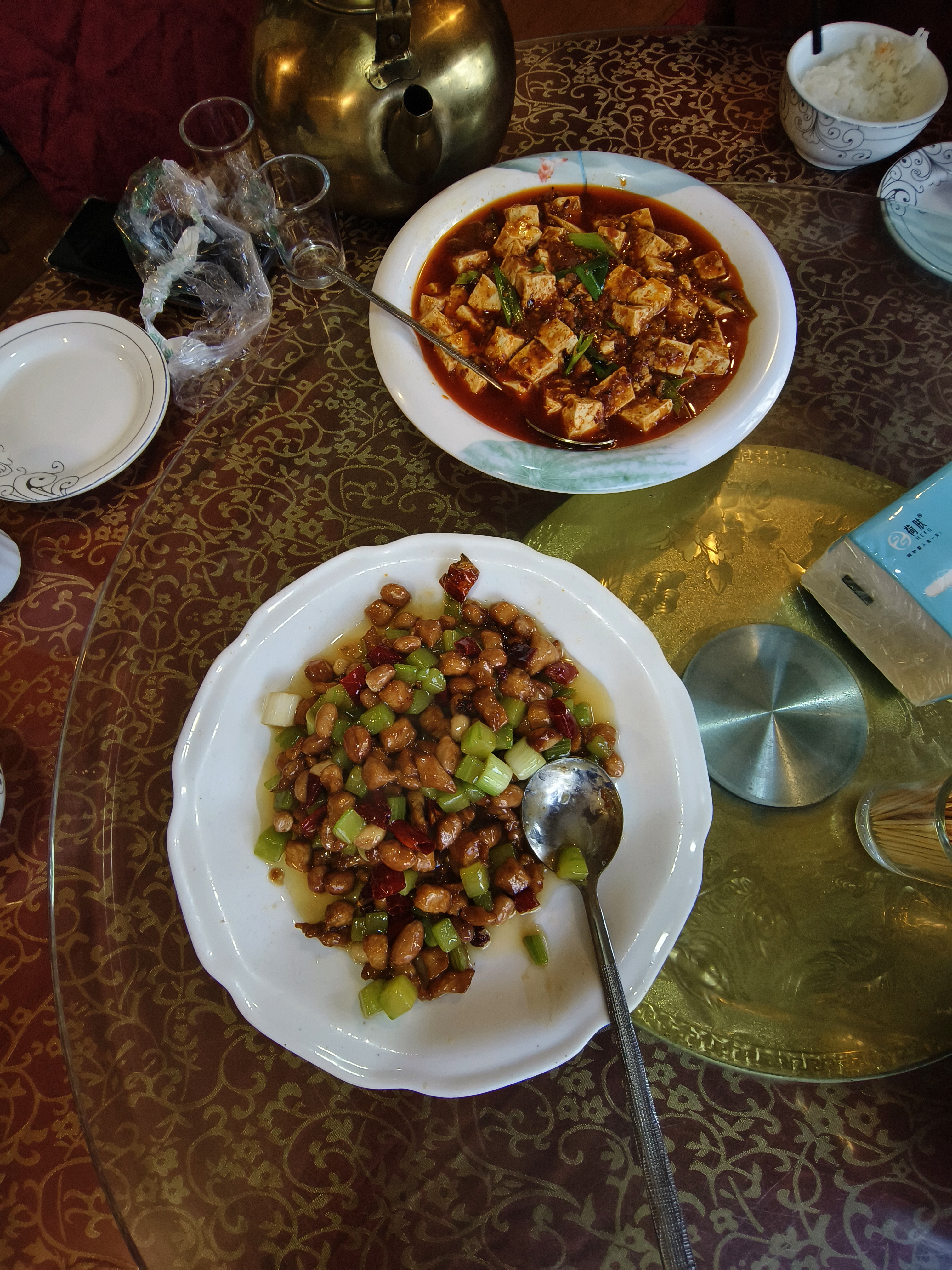端上桌是四菜一汤:宫保鸡丁裹着酱汁喷香,麻婆豆腐辣得够劲,辣椒炒肉油润下饭,还有脆生生的烤薯片,配着清爽的青菜西红柿蛋汤——每一口都吃得熨帖,那叫一个巴适,赶路的累似都被这口热乎饭消了大半。