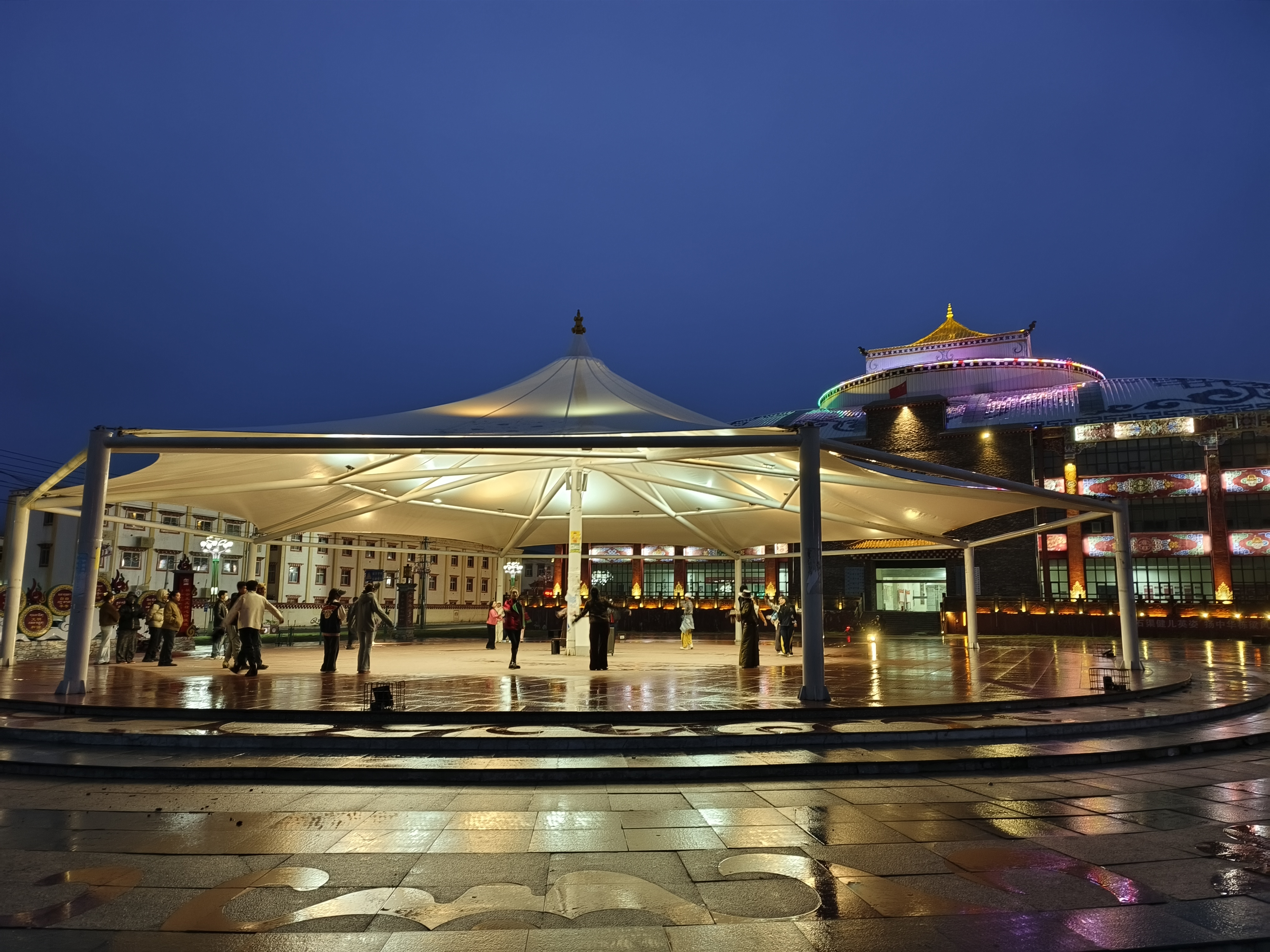 隔着饺子店玻璃,对面就是康巴文化广场,饭后正好凑个热闹,跟着跳了会儿锅庄舞,既能消食又能出出汗。可惜天不作美,没跳多久就下起雨来,只好作罢,回去休息,养足精神,明天好整装待发。