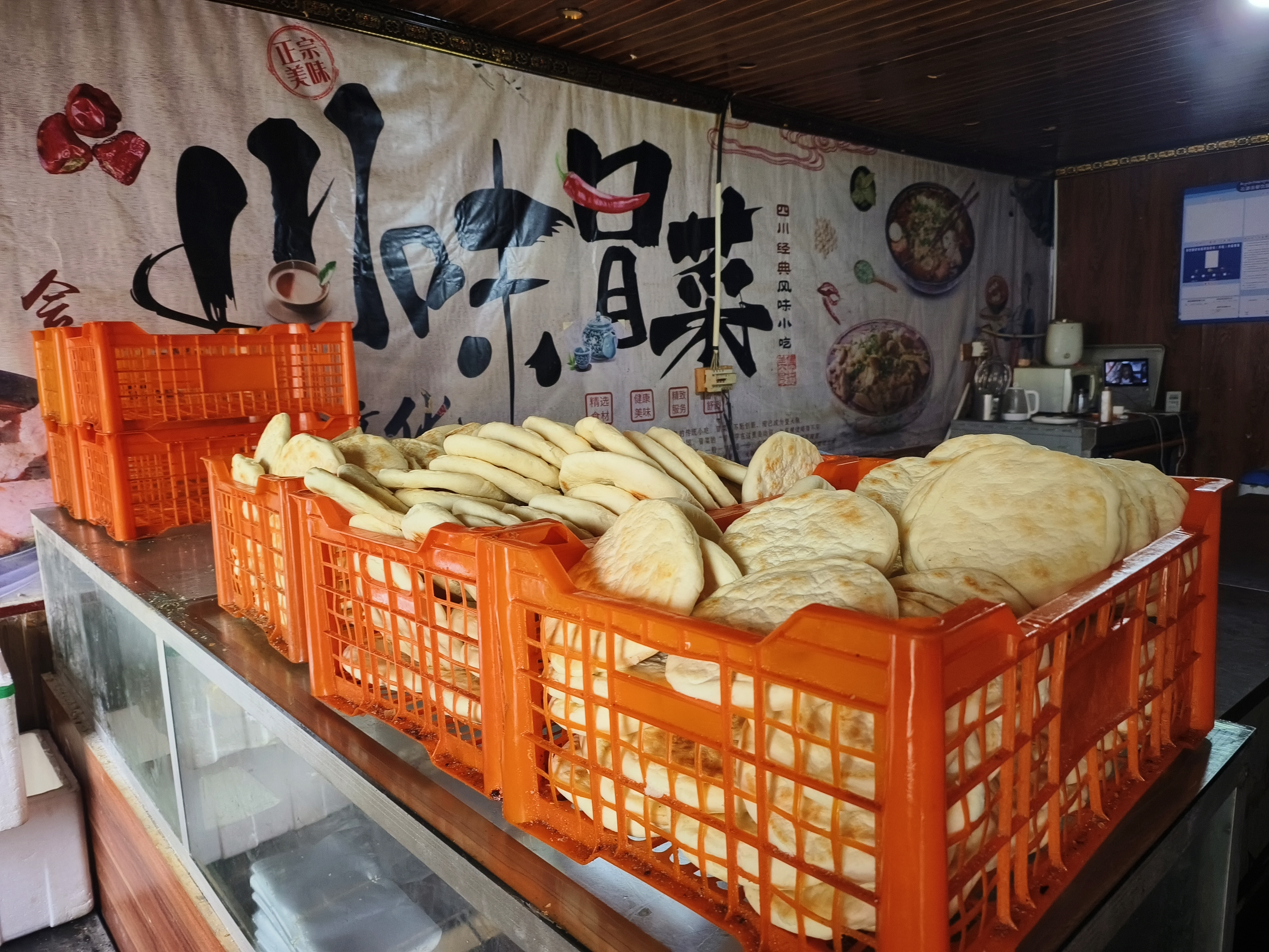 已近中午,我们抵达附近的色须镇。司机径直将车开到他惦念的“胜利馍馍店”,一下买了十几块面饼。我尝了一块,只觉外皮略焦、内里松软,能吃出麦香,但整体口感比较普通。我们没有在镇上找馆子吃饭,稍作停留后便继续赶路。
