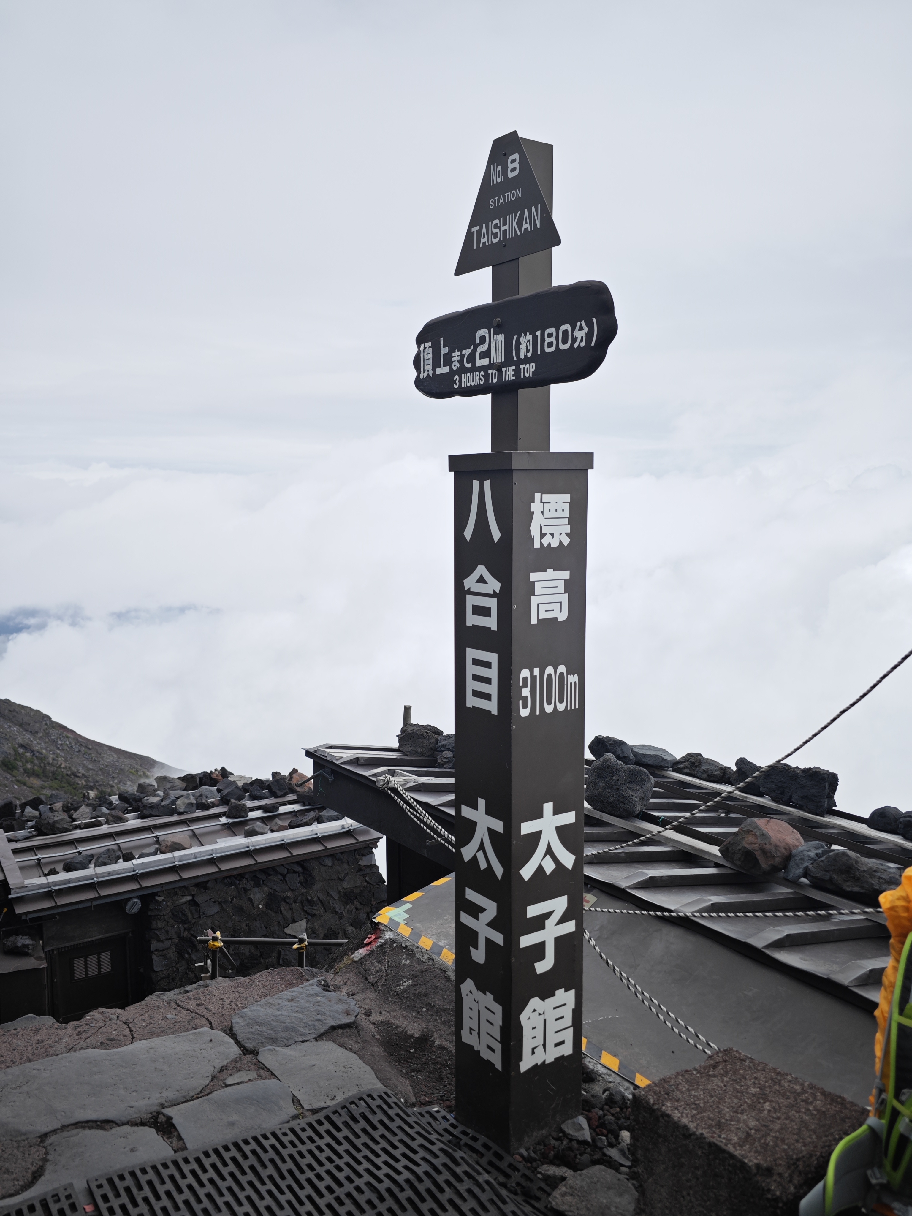 13:38我到达海拔3020米的八合目路标,之后依次经过太子馆、蓬莱馆、白云庄和元祖屋。在太子馆,我遇到了在山下曾交谈过的几位中国驴友,他们来自山东、HK等地。来自世界各地的游客坐在通道的凳子上,聊聊天,并拍摄山腰云海笼罩的富士山。太子馆卖的饮料,是500日元一瓶水,600日元一瓶茶,比其它八合目小屋卖的便宜。我一路消耗掉了两瓶水,就买了两瓶作为补充。