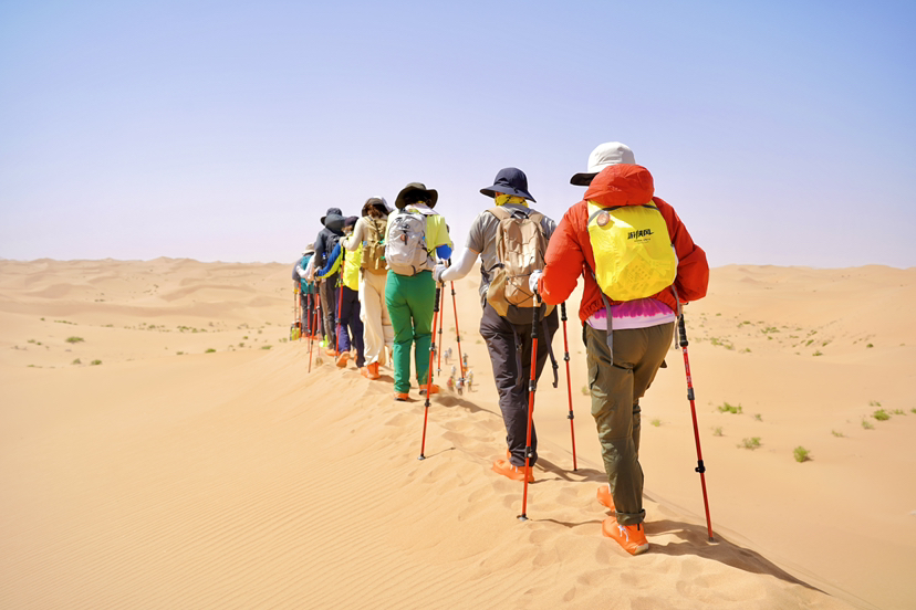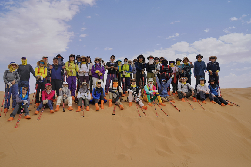 沙漠徒步真正考验着每个人的毅力。“走一步,退半步”,体力的消耗比想象中更大。烈日当空,沙地温度升高,大家都用魔术头巾将头脸包裹得严严实实,只露出一双坚定的眼睛。