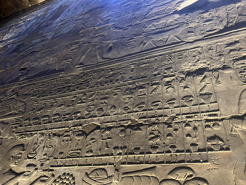 晚上夜游了卢克索神庙,夕阳和灯光下真的非常美,从这里可以看到原来和卡纳克神庙联通的道路。这里总共有三个宗教古埃及、古希腊和伊斯兰教,原本这里被土埋住,在上面有个清真寺,后来才在底下挖出来神庙,目前清真寺还在供信徒正常使用。亚历山大占领埃及后,在这里建了礼拜堂,在原来的古埃及壁画上盖上了古希腊壁画,仔细看还能看出来痕迹。也可以看到古希腊和古埃及的立柱,上面的花卉不一样,古埃及人使用莲花。这里的壁画上可以看到古埃及人的时间标记,比如日出是甲虫,日间是圆盘太阳,日落是羊,也可以看出古埃及人的计数,还有生殖崇拜。