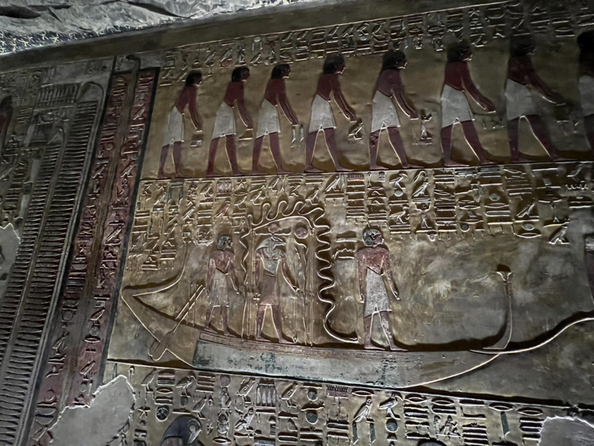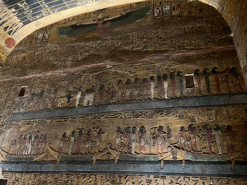 次日去了帝王谷和哈布城。帝王谷是新王朝法老害怕被盗墓,才开始建立在山谷里的,但是仍然难逃被盗的命运。这里有六十多个墓穴,都是国王的。我们除了通票还买了几个特窟,没有白花钱,特窟的壁画真的保存的非常好,很震撼,上到天文下到地理,包括日历和节日全部都画在墙壁和天花板上。各种象形文字,古埃及人真的好聪明啊。壁画里蛇代表保护神,有时候也是恶魔,如果看见现在国王前面和国王面向同一个方向的就是保护神,但是如果对着国王站着就是恶魔。太阳船是在地下世界,上面站着国王和他的灵魂,12个小时每个小时保护神,国王每到一个保护神就要说一个密码,如果是坏的就会被砍了头,放在圈圈里。其中太阳神是人身和羊头,阿努比斯一直在打击国王和太阳神,目的是不让太阳再日出,国王说不出来密码眼镜蛇就会吃了他,不让他复活。如果看到了基督教的图案,是当时亚历山大的基督教徒来到这里住在坟墓里时雕刻的。还看了图坦卡蒙的墓穴,前两天在开罗看了他的陪葬品,现在看了他的墓穴。他的墓穴有他的木乃伊,画了12个狒狒代表12个小时,他的墓穴很小画也不多,因为他9岁继位18岁就去世了,但是他陪葬品保存完好让大家学习了古埃及的培养文化。
