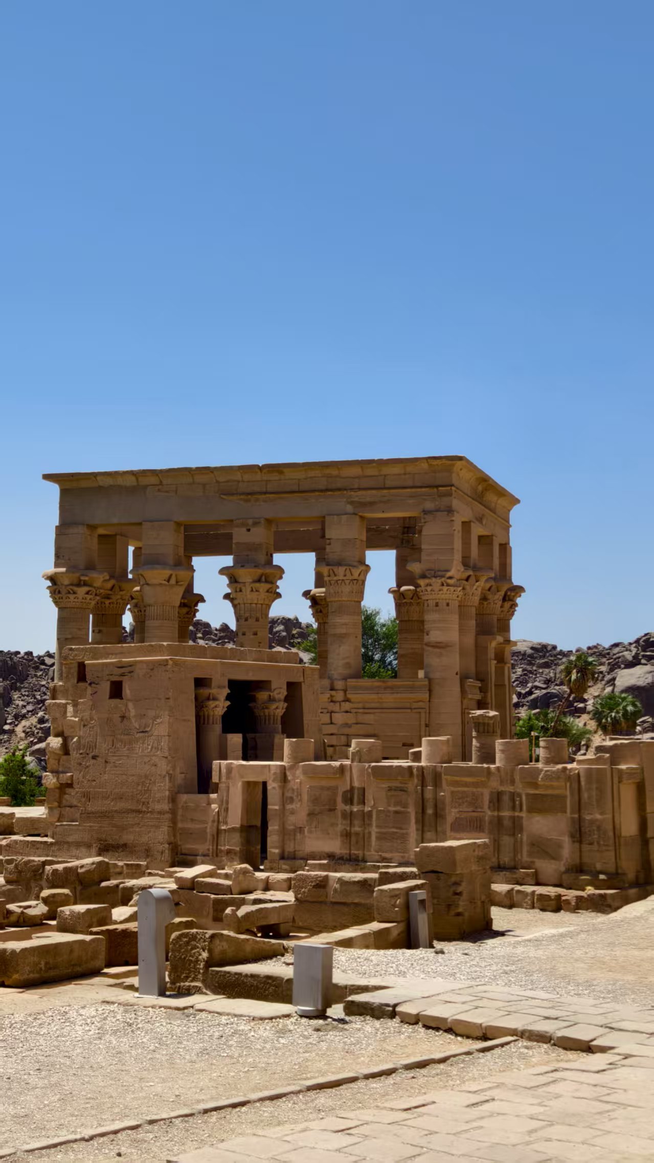 菲莱神庙。这座神庙是献给伊西斯女神的,原本建在菲莱岛上,后来因为修建阿斯旺大坝,水位上升,神庙被整体搬迁到了附近的阿吉勒基亚岛上。走进神庙时,我惊讶地发现,神庙的很多地方都被水浸泡过 —— 墙壁上有明显的水痕,有的浮雕甚至已经模糊。向导说:“幸好搬迁及时,不然这座神庙早就被淹没了。” 菲莱神庙的壁画很有特色,大多是伊西斯女神寻找丈夫奥西里斯的故事,还有一些是古埃及的天文知识,比如星座的图案。傍晚时分,夕阳照在神庙的石柱上,石柱的影子被拉得很长,整个神庙都笼罩在金色的光芒里,美得让人窒息。