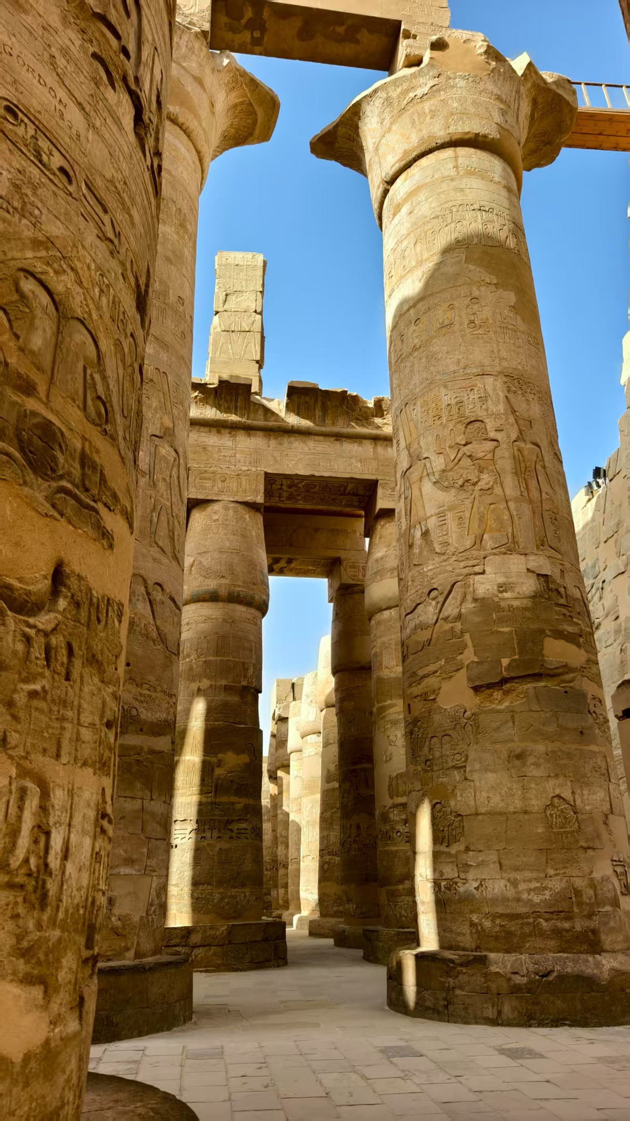 卡尔纳克神庙。这座神庙是古埃及人献给太阳神的,占地约 200 亩,光是多柱厅就有 5000 多平方米,里面立着 134 根石柱,每根石柱都有十几米高,最粗的需要五六个人才能合抱。走进多柱厅时,阳光从石柱的缝隙里漏下来,在地上投下斑驳的影子,石柱上刻满了象形文字和浮雕,有的是法老祭祀的场景,有的是神话故事。向导指着一根石柱说:“你看,这些象形文字里藏着‘永恒’的意思,古埃及人相信,只要神庙还在,他们的文明就不会消失。”