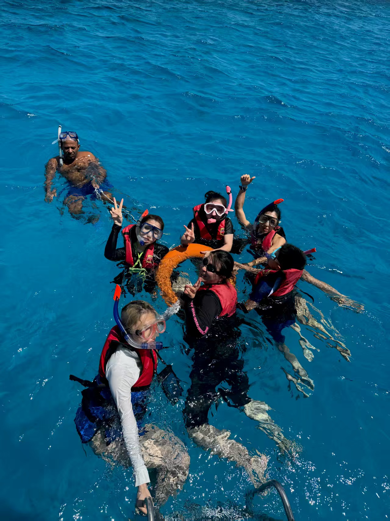 第二天去出海,我忍不住惊呼 —— 红海的蓝是分层的:近岸处是透亮的浅蓝,像融化的碎冰;往深处走,颜色逐渐加深,成了深邃的宝蓝;再远些,竟与天际的淡蓝融在一起,分不清哪里是海,哪里是天。教练拉着我的手,慢慢往海里游,水下的世界瞬间展开:彩色的珊瑚像盛开的花朵,有的呈粉色,有的呈紫色,轻轻一碰,还会缓缓收缩;成群的热带鱼在珊瑚间穿梭,黄色的、蓝色的、橙色的,像撒在水里的宝石,有几条胆子大的,甚至会啄我的手指。