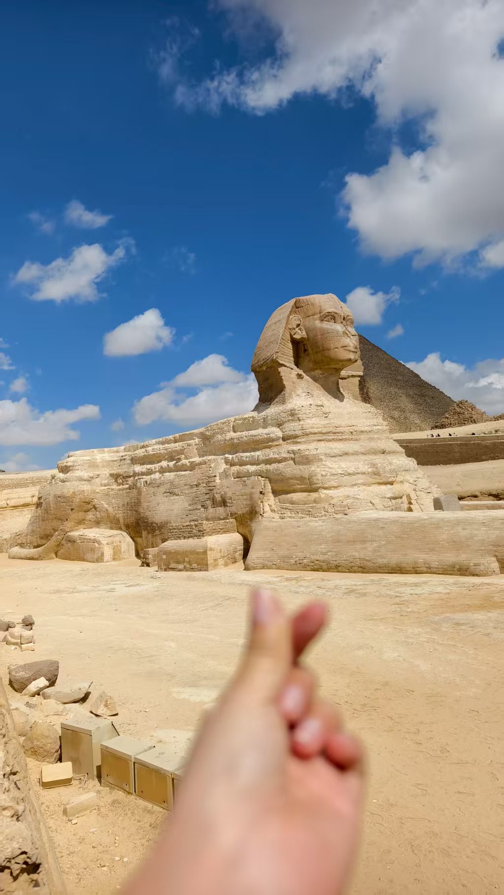 绕到金字塔东侧,便是狮身人面像 “哈夫拉”。它卧在沙地上,身长 73 米,高 20 米,脸部刻着哈夫拉法老的轮廓,只是鼻子早已残缺 —— 关于鼻子的去向,穆罕默德讲了个有趣的传说:18 世纪时,一位阿拉伯军官觉得狮身人面像 “盯着自己”,一气之下用大炮轰掉了它的鼻子。如今,它依旧沉默地望着东方,晨雾里像个守护沙漠的老者,见证了千年的日出日落。