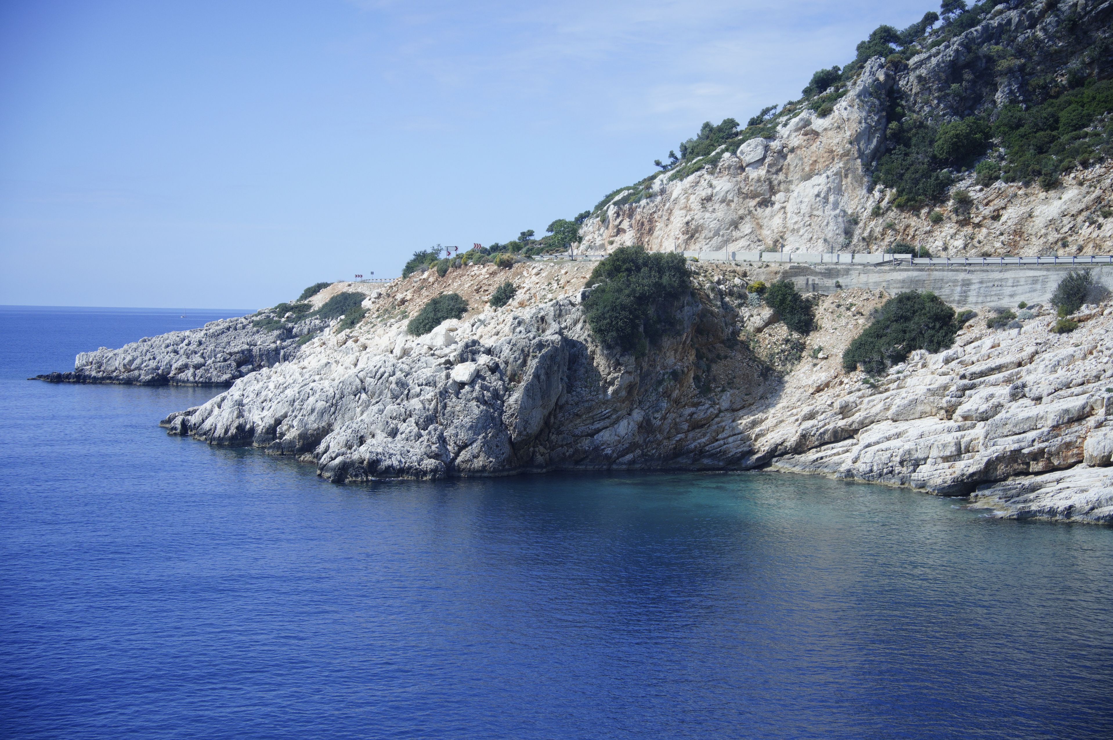 沿着D400公路向南行驶,右侧是陡峭的悬崖,左侧是蔚蓝的地中海。这条被誉为世界十大最美沿海公路之一的道路,每一个转弯都是一幅全新的画面。