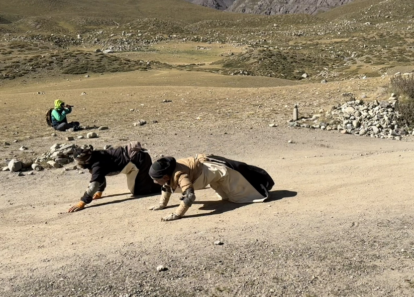 路上我们碰到第一个磕长头的信徒是在一个布满石头的下坡路上,看来无论地形多么复杂他们是确定要以匍匐之姿虔诚转完,这一幕真实的出现在眼前还是觉得震撼,后在海拔最高的卓玛拉娅口、大风口也是如此。每次经过磕长头的信徒,我们小心翼翼的路过,“扎西德勒”是我们想要互动又怕打扰的方式。他们的膝盖,手掌虽说都会做一些防护,但清晰可见的是布满灰尘的额头,路上都是石块和石子会不会磕破头呢?普通人,包括藏族同胞在高海拔地区缓慢行走都会有高反,他们的每一步,反复匍匐起身难度是数倍于我们,而这样的转山共有50公里左右,仅仅是旁边观察我的内心满是心疼和怜悯,以及不理解。