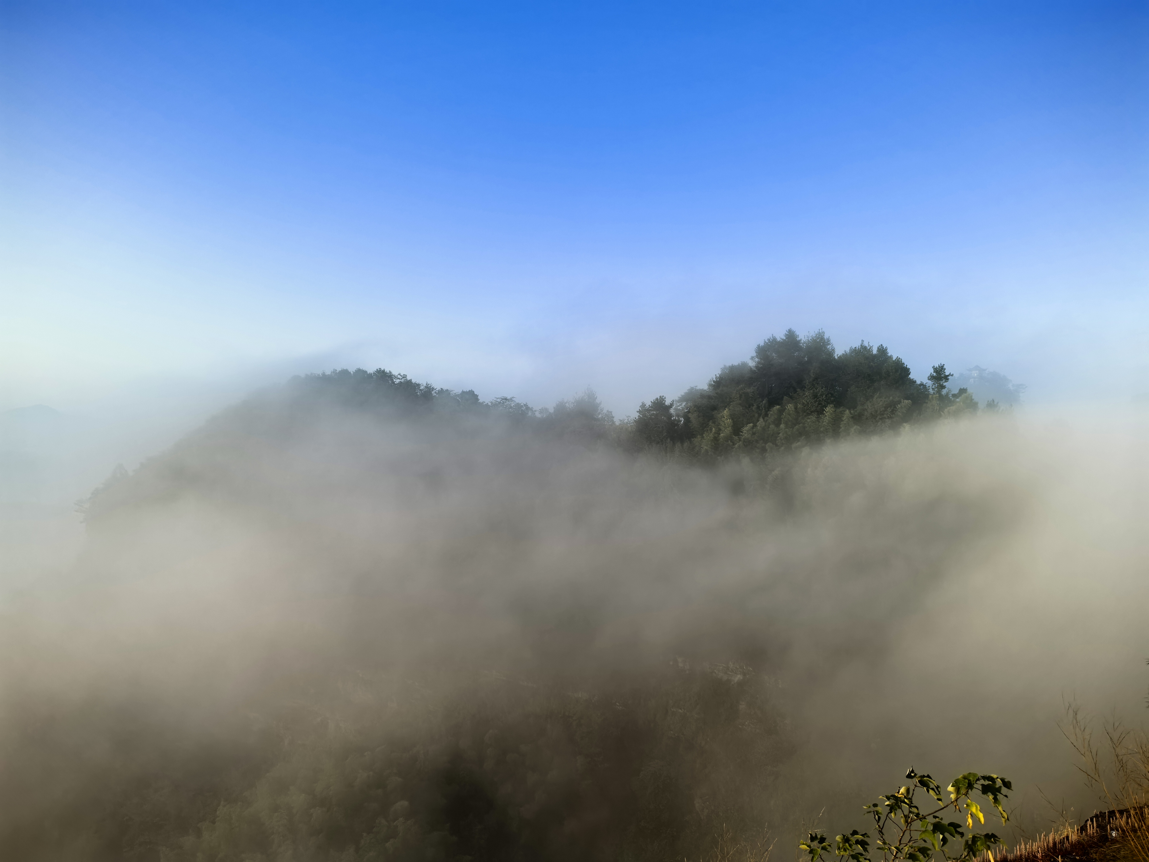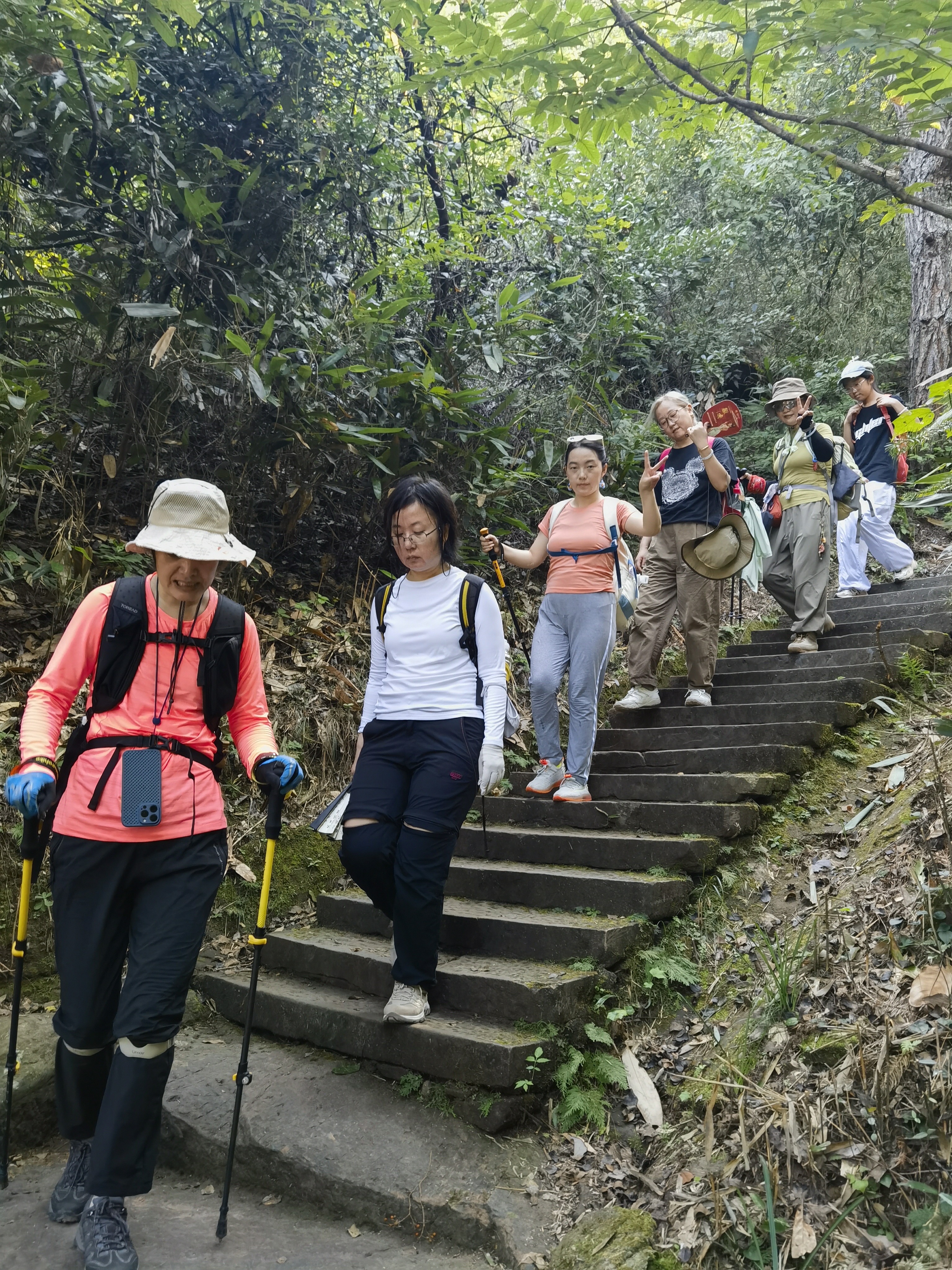 早餐后整装出发,转过青石巷的最后一个弯,晨光骤然倾泻而下,那轮金乌恰从云海边缘探出半张脸,将第一缕阳光锻成金丝,斜斜织在登山道的麻石上,队伍向最高峰前行。