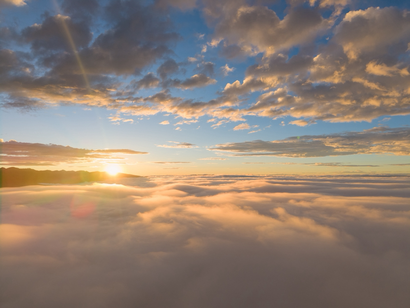 清晨,我们前往郎依寺观景台期待日出。然而,地面角度大雾弥漫,白茫茫一片,大多数团友在等待无果后选择下撤回酒店补觉。只有我和舒阳、王敏两位老哥不甘心,决定继续坚守。我们操作无人机尝试穿云。在一次次爬升后,当飞机冲破300米厚的云层,监视器屏幕上赫然出现了波澜壮阔的云海和刚刚跃出地平线的朝阳!那一刻的狂喜,难以言表,所有的坚守都是值得的。我们一直等到9点多,虽然地面雾气未散,但我们通过航拍器尽情记录了这份专属于坚持者的云海盛宴。