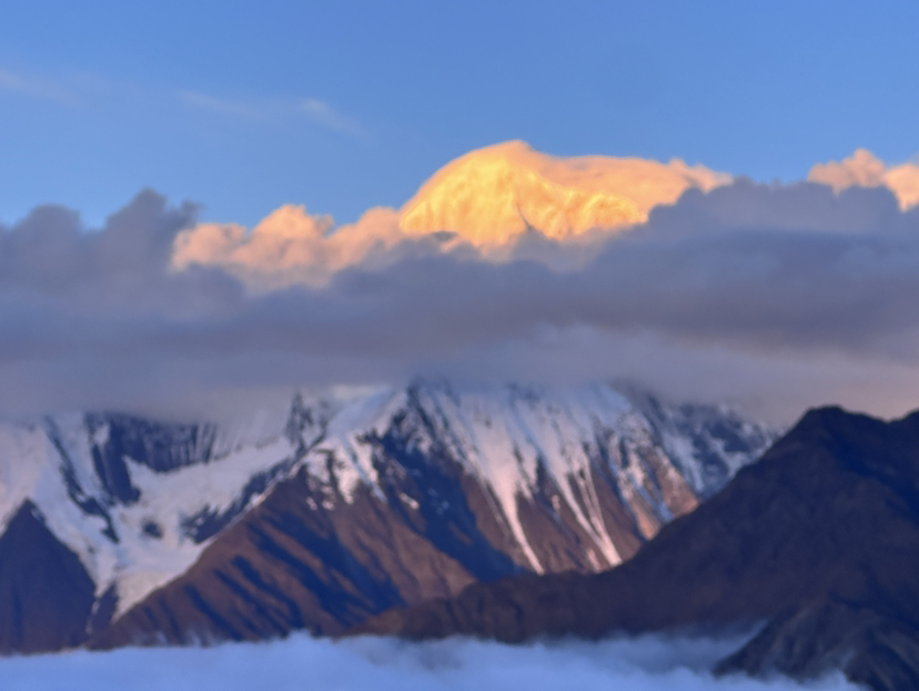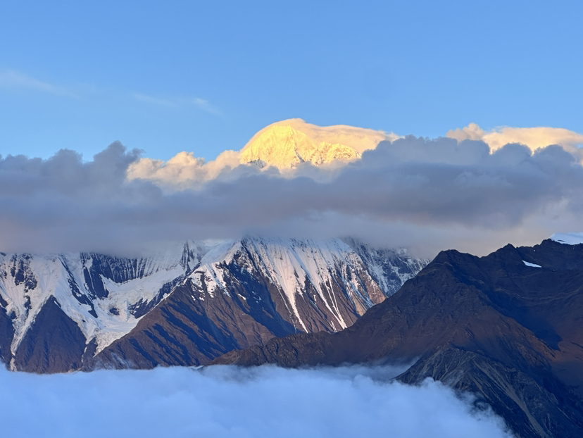 第三天,我们前往坐若湖。坐若湖是一个季节性海子,只有在7-11月份才有水。当我们到达时,湖面平静如镜,倒映着周围的雪山和蓝天,景色如画。在坐若湖畔用过午餐后,我们便出发翻越玉龙西垭口,前往子梅垭口欣赏日落。子梅垭口是贡嘎西坡观景点到达最便捷的机位,这里的日落景色十分壮观,金色的阳光洒在贡嘎主峰上,与周围的云海相互映衬,构成了一幅绝美的画面。