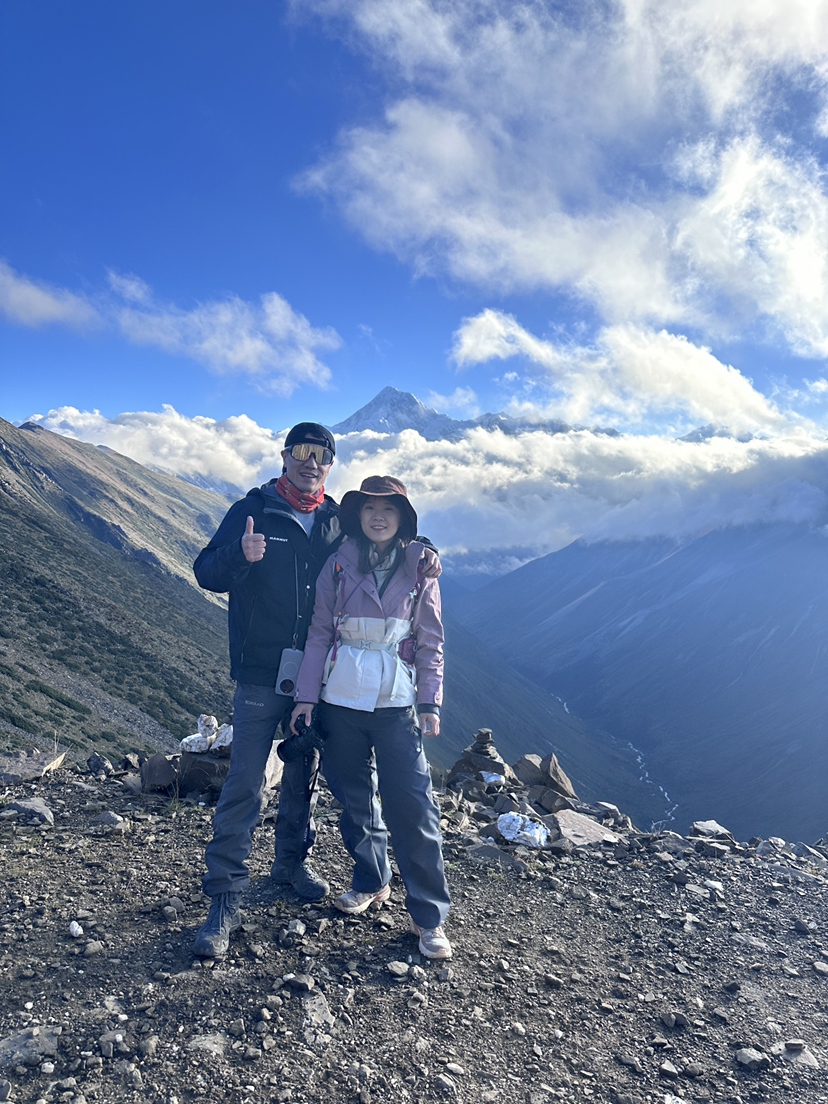 第二天,我们正式开始了徒步之旅。第一站是三恩措,从徒步起点出发,经过一段长爬升的机耕道,我们翻上了第一个垭口。此时,达多曼因与朗格曼因等众多山峰突然映入眼帘,贡嘎山脉的雄伟壮观让人震撼不已。继续前行不久,我们便来到了三恩措,这是一片位于沼泽中的海子,湖水清澈,周围环绕着雪山和草甸,景色十分迷人。