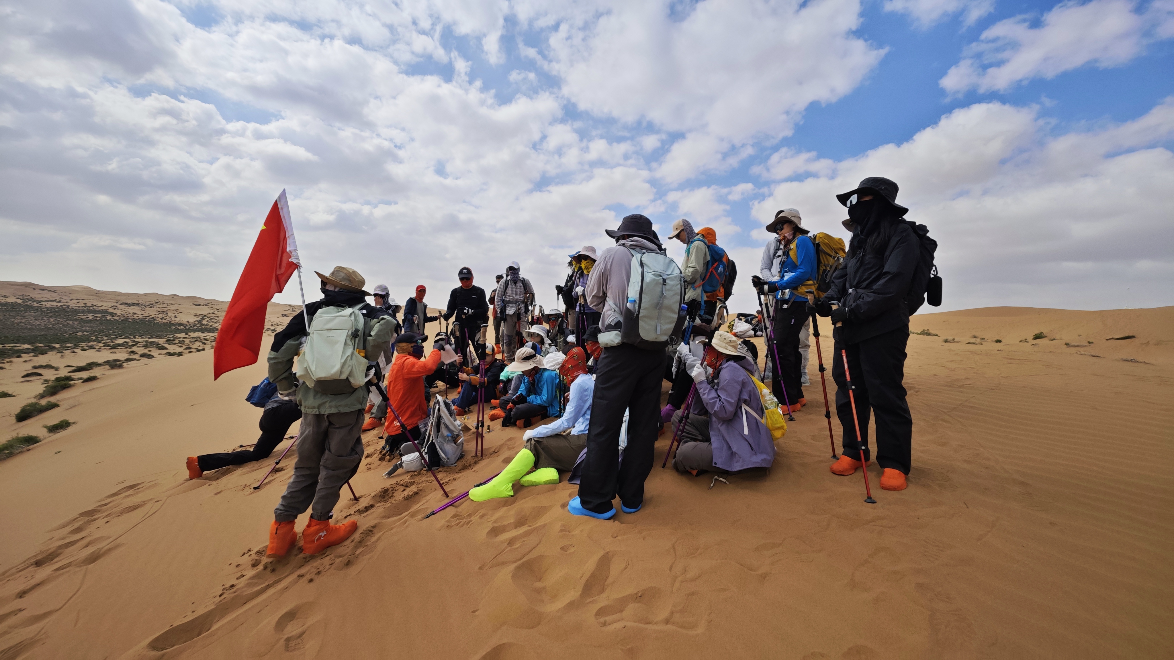 我们一行41队员+3领队,一早乘坐大巴车到沙漠中转起点,中途上个🚾,经2.5小时到达徒步起点,沙漠风超级大,简单整理好着装和行李后,领完物资补给,拿上登山杖,拍过大合影以后,全副武装,简单拉伸后,顶风出发。因为对我们来说,有很多属于平时不运动的小伙伴,简单的热身可以降低我们受伤的风险,相当不错