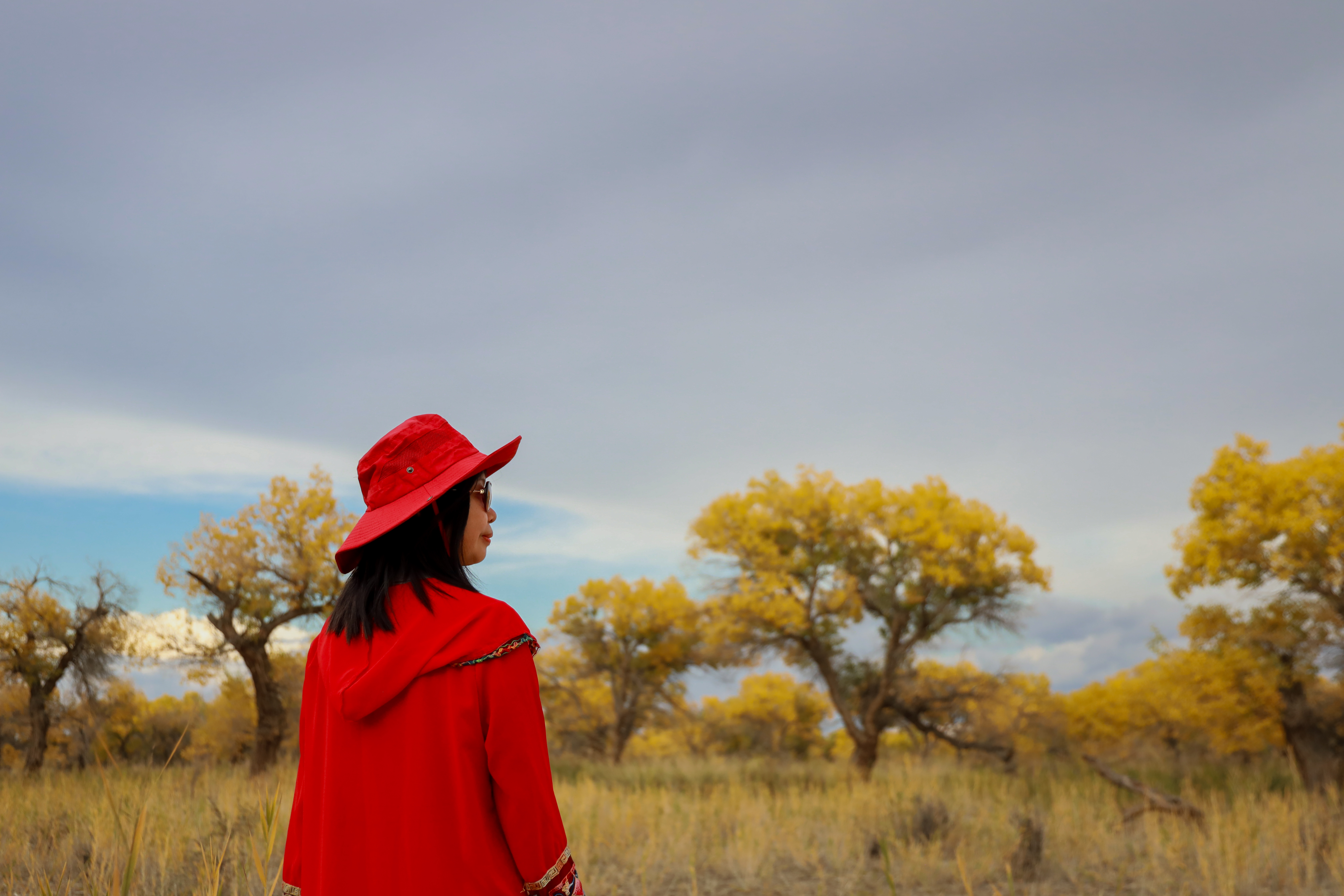 下午4:30,胡杨林正在上演它一天中最辉煌的戏剧。阳光斜穿过枝叶,把每片叶子都变成半透明的琥珀。林间小径上,同行女孩小心地避开一丛红柳,她的披风被风扬起,成了这片金黄中唯一的亮色。