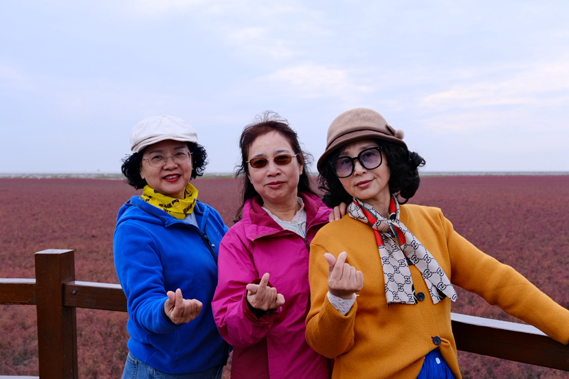 沿木栈道深入滩涂,脚下是松软的泥地,身旁是摇曳的碱蓬草,风过时,整片红滩泛起层层“红浪”,连空气都浸着淡淡的海腥与草木清香。行至“廊桥爱梦”景点,曲折的廊桥穿梭在红滩间,站在观景台远眺,红滩漫向天际,与远处的稻田画相映,金黄与赤红碰撞出秋日独有的热烈。