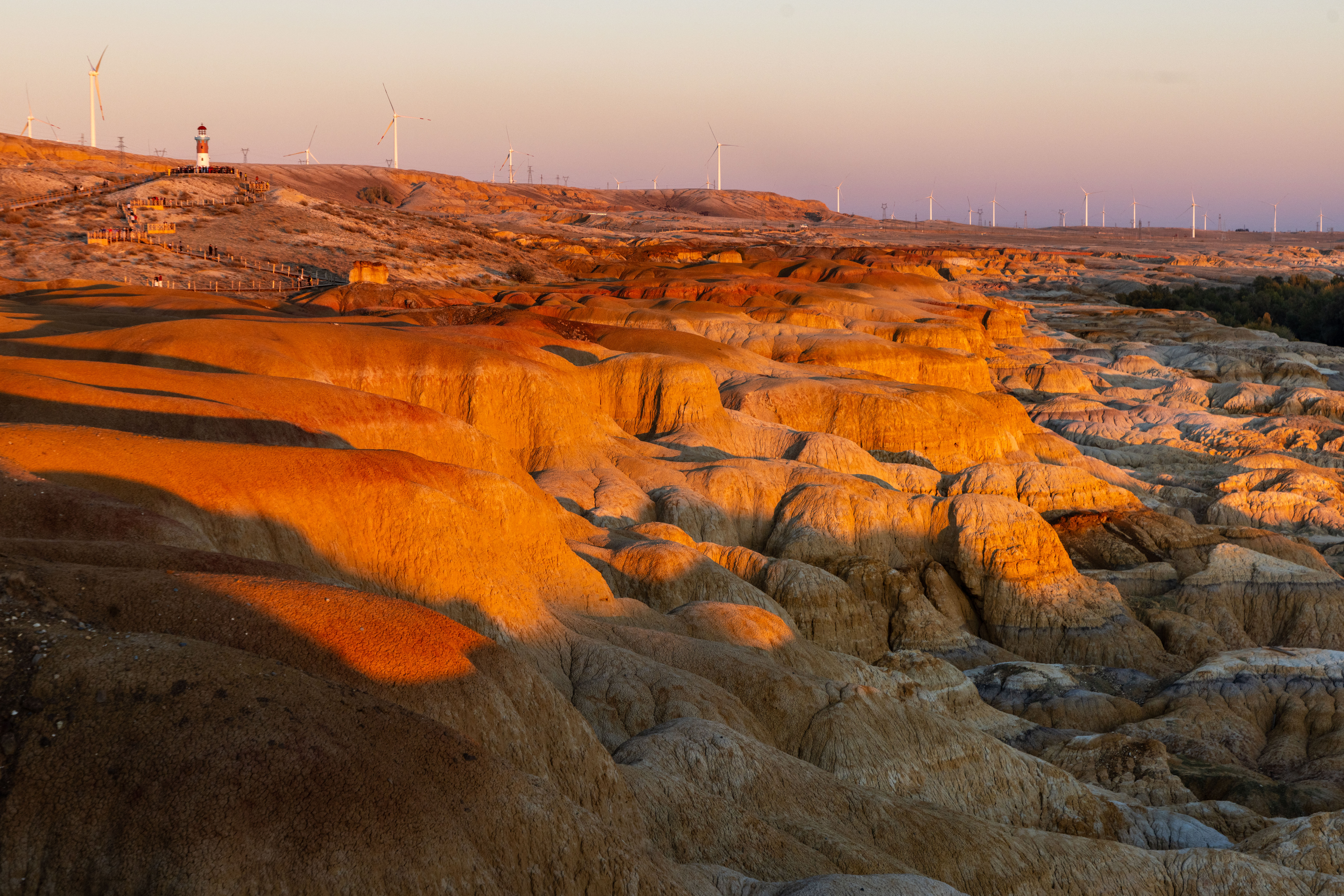 第二天行程的海上魔鬼城,属雅丹地貌,由长期风蚀雨蛀形成斗圆形坡体,南北绵延十余里,因形似水上城堡而得名。