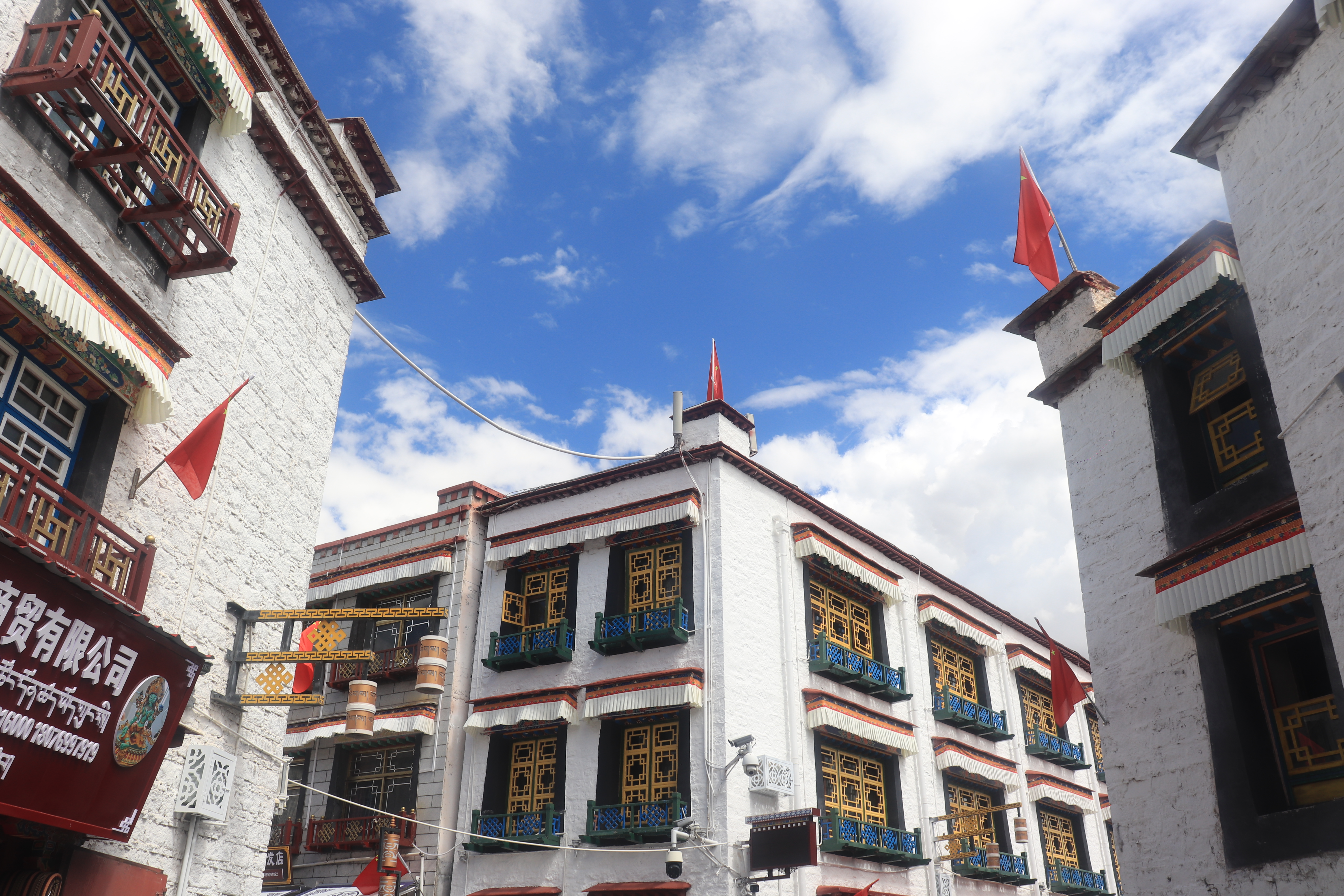 街道两旁是白色的藏式建筑,彩色的经幡在微风中轻轻摇曳,仿佛在低语着古老的故事
