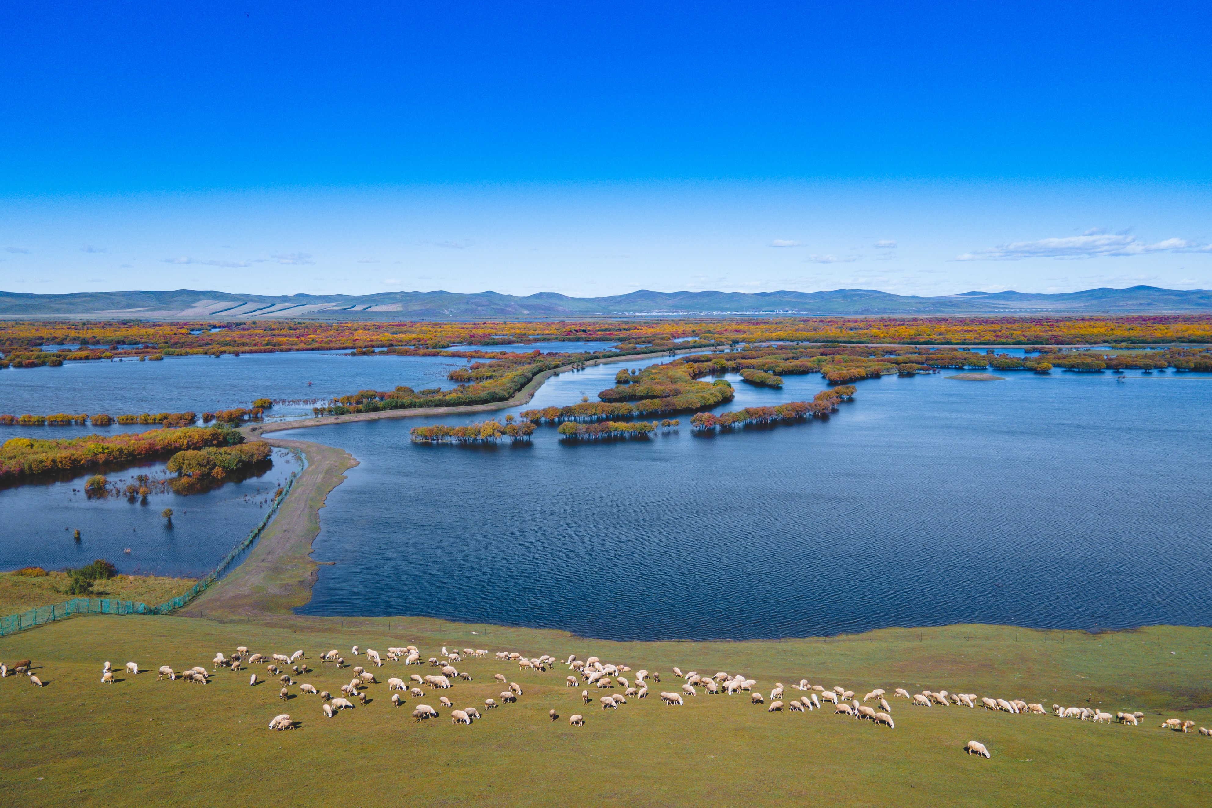 开始泛黄的草甸、深绿的水洼,和蓝色的河水交织在一起