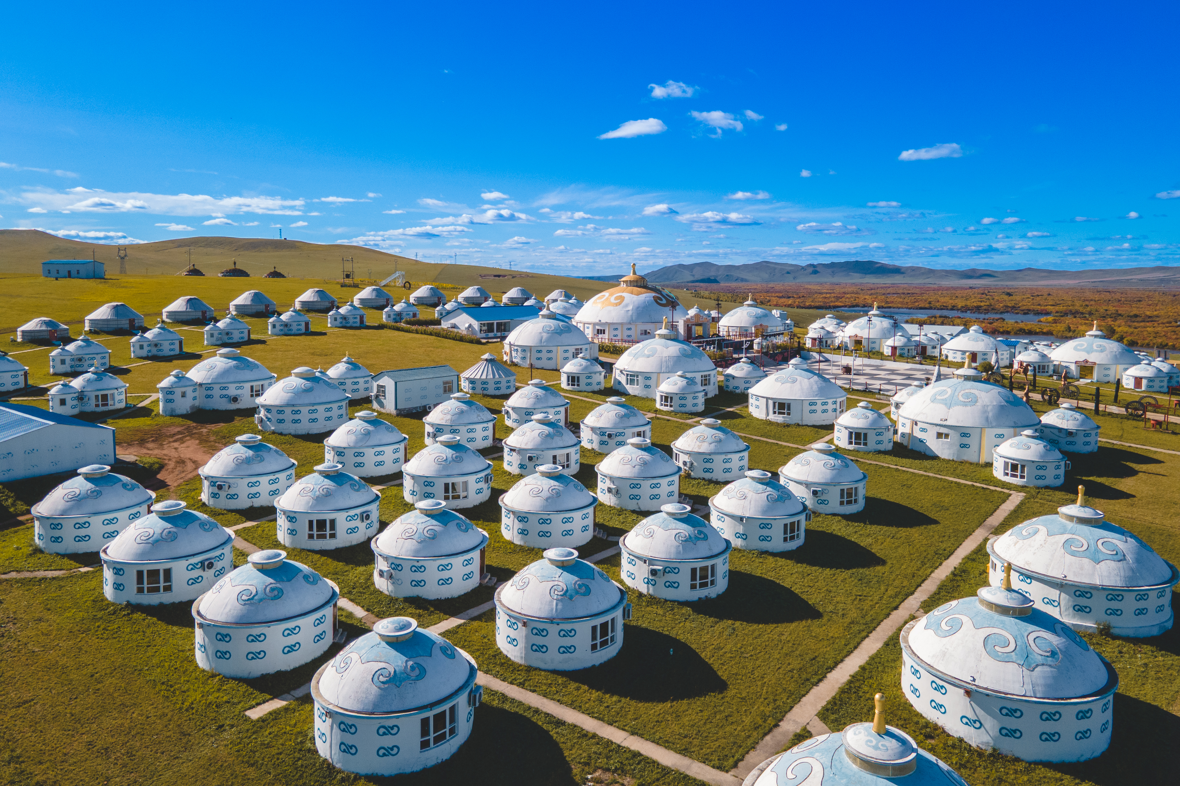 一眼望过去,白色 蒙古 包像珍珠一样撒在辽阔的草原上