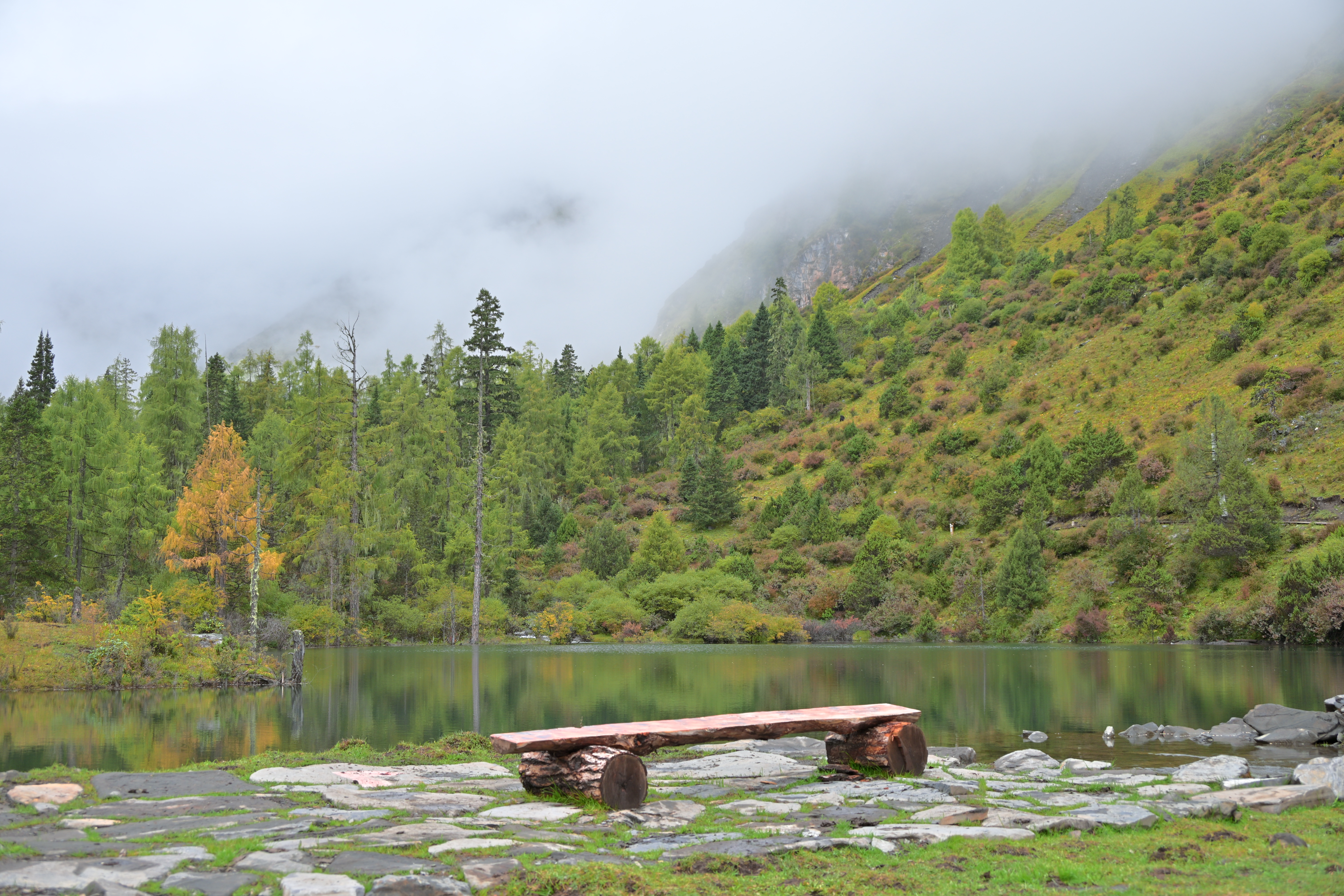 摆渡车载着我们继续深入山谷,在四姑娜措湖畔,我蹲下身触摸冰凉的湖水。倒影中的雪山与彩林重叠,恍惚间分不清哪片是真实。同行的北京姑娘小林突然指着水面:"看!彩虹!"果然,细碎的光斑在涟漪中聚成七色光带,引得众人纷纷掏出手机。