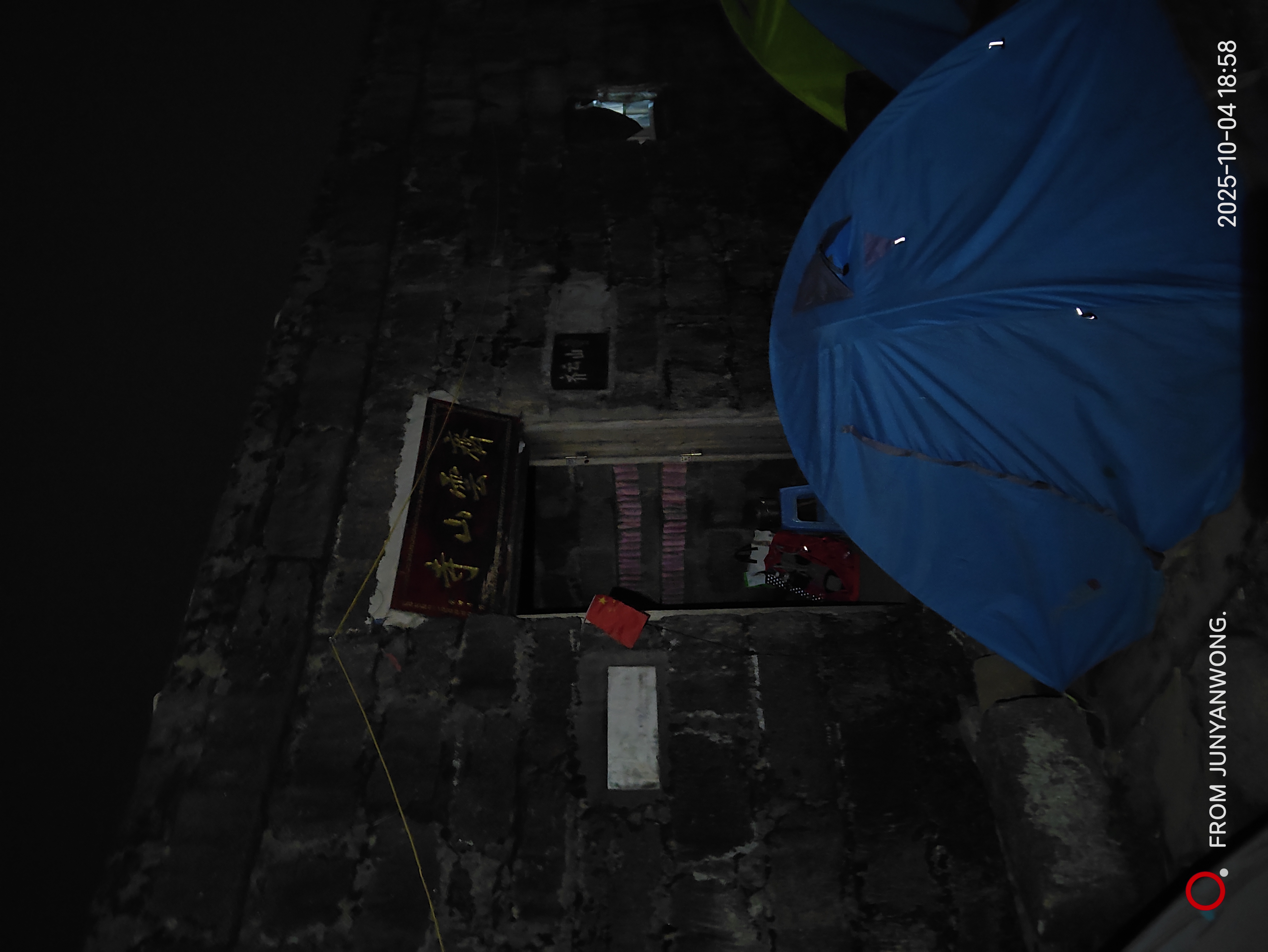 继续沿连绵起伏山坡行走,途经一片茂密芒草地,刚好夕阳西斜,黄色光芒映照金色草甸,沐浴于此,倍觉温暖动人。向前走途经界碑,直走为齐云峰,左转为江西方向。踏过宽大的石路面,前方就是营地。国庆黄金周,帐篷众多。我们的帐篷就在齐云山寺门口,寺庙用方正的麻石砌成,内供奉观音菩萨。这营地位于齐云山顶下方约一百多米,有帐篷租赁,每顶一百二十元。旁边还有小卖部,有泡杯面和饮料售卖。天色已变昏暗,其他队友也陆续到达,齐煮晚餐,开吃。