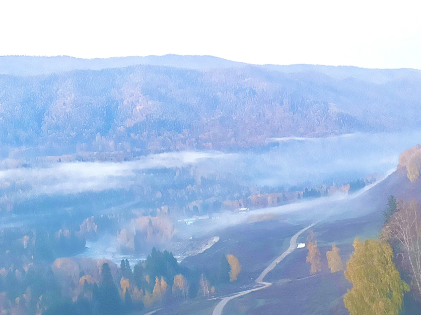 9月底的阿禾公路无疑是美的,漫山遍野的树木,层林浸染。抵达禾木时,已是下午2-3点。午饭过后,在美丽峰和云霄峰之间选择了云霄峰,一则是冲着2800米山顶的雪景,二则是由于山顶竖立着四国交界的木桩打卡点。遗憾的是,我们上去的那天,山顶积雪并未形成,下着小雨,四周的能见度并不高,且由于山顶风太大,华丽丽的感冒了。但第二天一早的禾木晨雾不负其名,很好的抚慰了前一天选择失误而带来的落差。