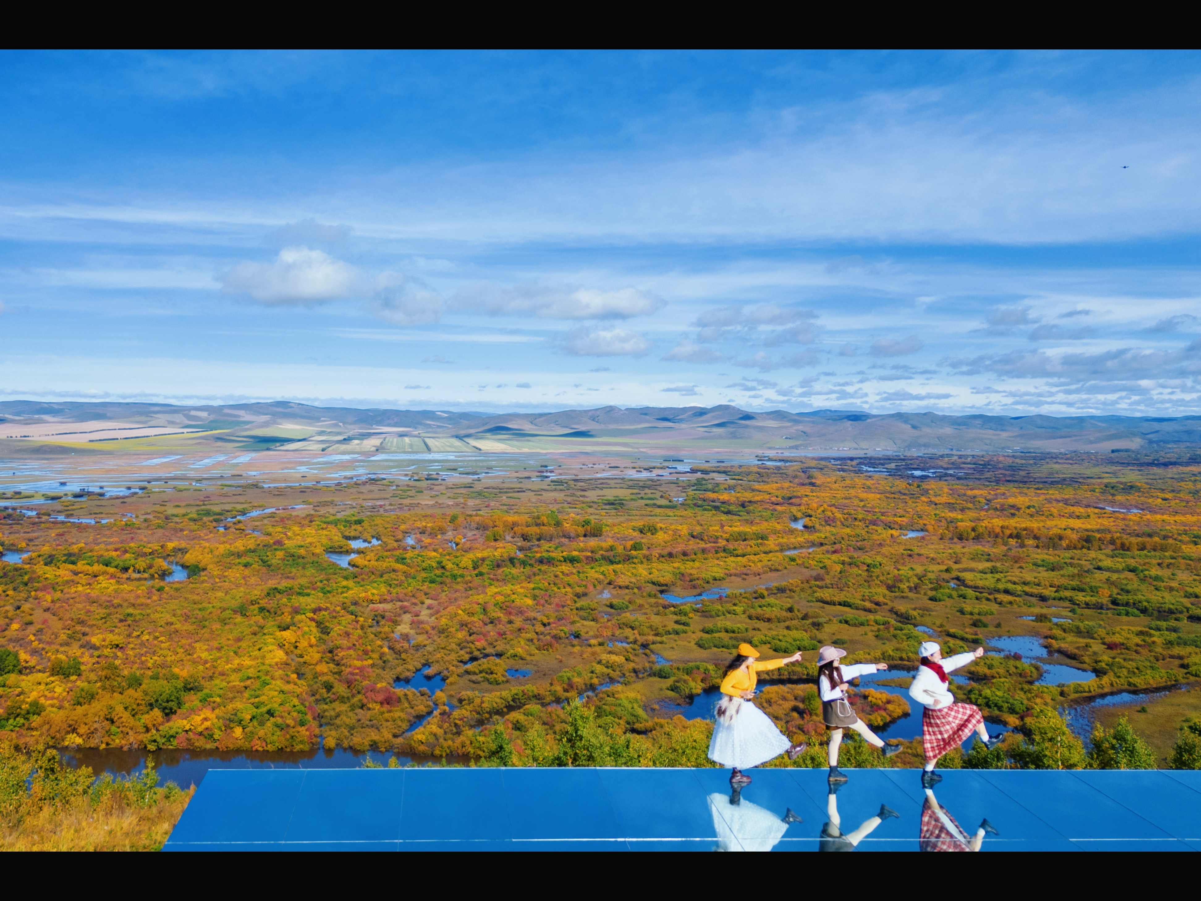 区别于额尔古纳湿地景区观景以俯瞰为主,这里是让我们走到湿地里面。园内秋色正浓,河流如血脉般穿梭其中,金黄的树叶倒映在河面,看起来把河水都“染色”了。