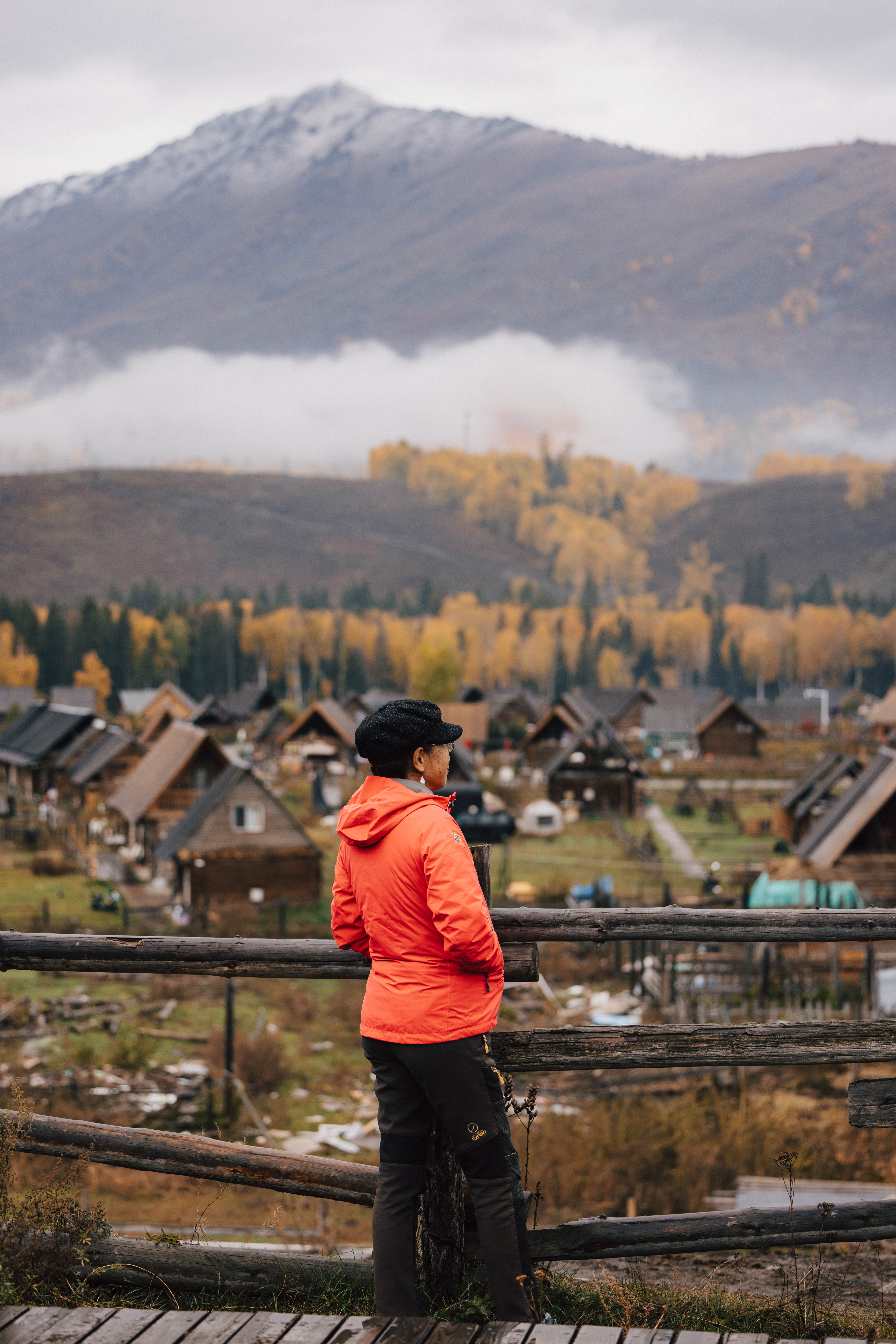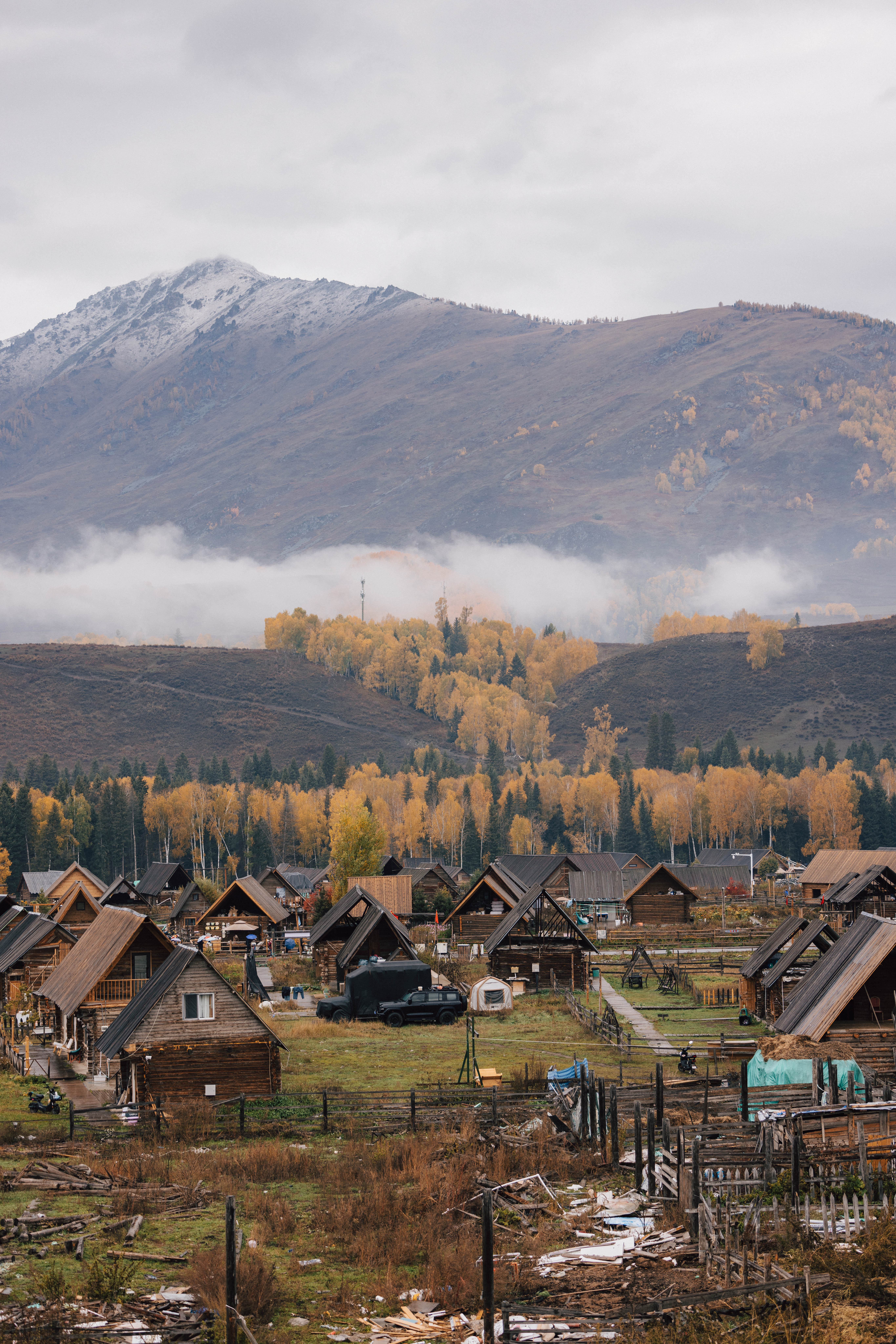 清晨的禾木哈登观景台风很大,超级冷,随着天慢慢亮起来,整个禾木村也开始有慢慢炊烟起来了,但天气也开始转阴了,阳光和晨雾都没有出现,拍摄到9点依旧没有太阳和晨雾,但天空开始下雨,便马上收拾东西下山吃早饭,雨越下雨大,大概持续了四十多分钟,下完雨之后山上开始出现了很漂亮的云雾