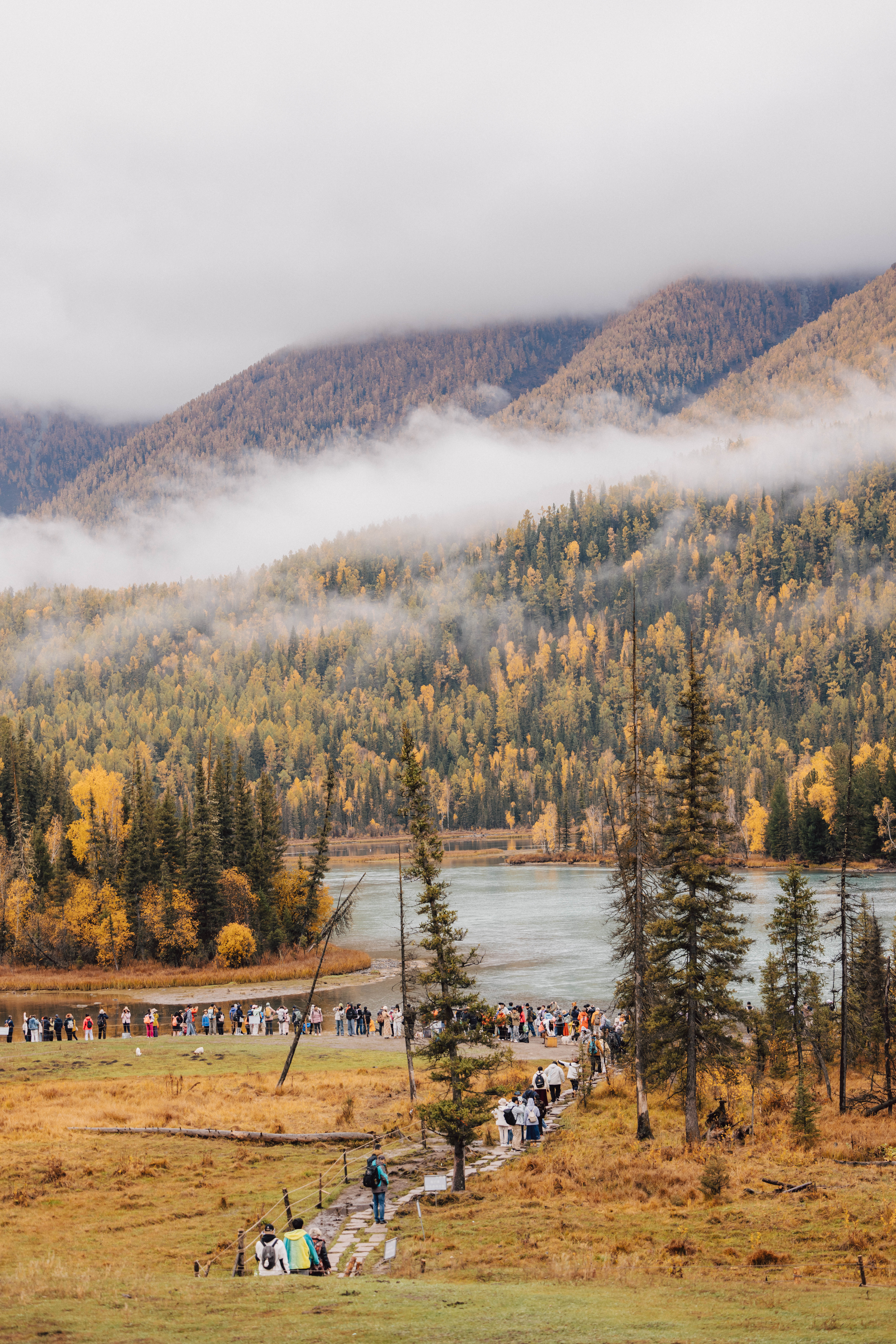 所幸今天天气转晴,由于昨天持续的下雨,早上神仙湾的晨雾特别美,月亮湾到卧龙湾徒步到风景也是超级赞,走到一半的时候收到通知说观鱼台开放了,有不少团友开始激动了,迅速走完喀纳斯三湾,马不停蹄前往观鱼台,争取不留遗憾