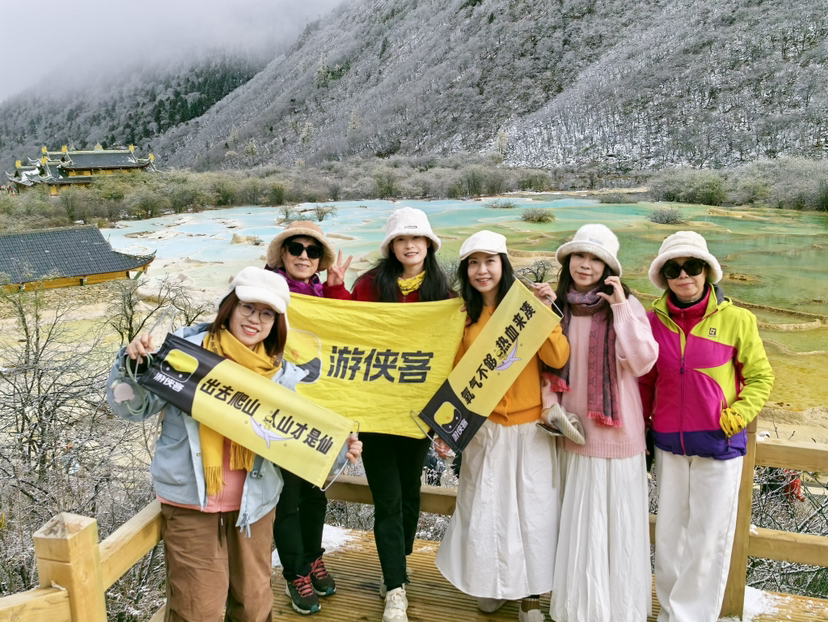 黄龙这天,天气格外眷顾我们。阳光下的钙华池群变幻着蓝绿黄各种色彩,宛如仙人撒落的翡翠。沿着栈道向上,争艳池、金沙铺地、五彩池各具特色。虽然海拔较高走得有些喘,但大家互相鼓励,分享氧气瓶,终于一起看到了最顶端的五彩池——那一刻的成就感,让眼前的景色更加动人。