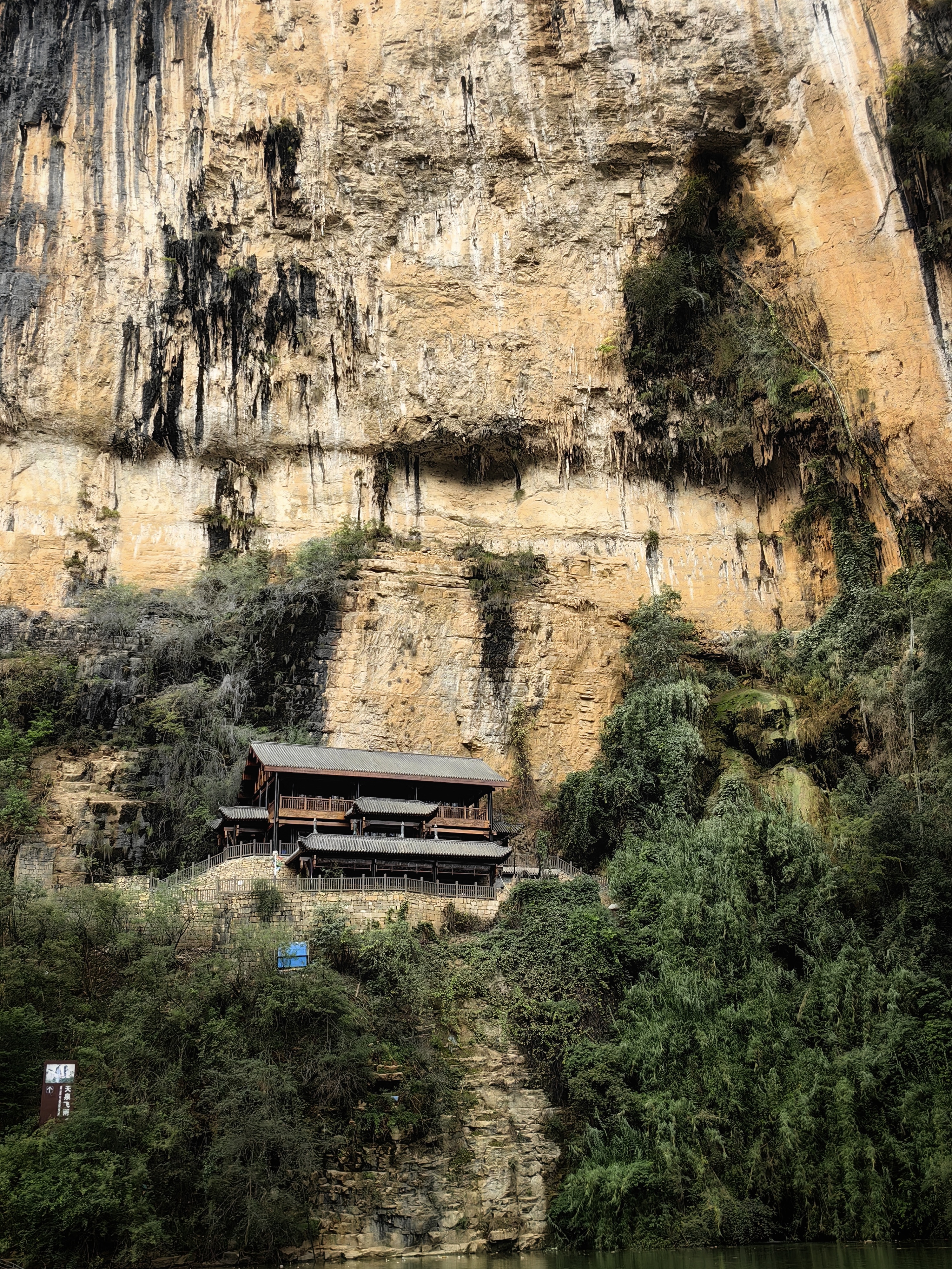 乘船游览小三峡,可看见岸上石缝中黑色的悬棺