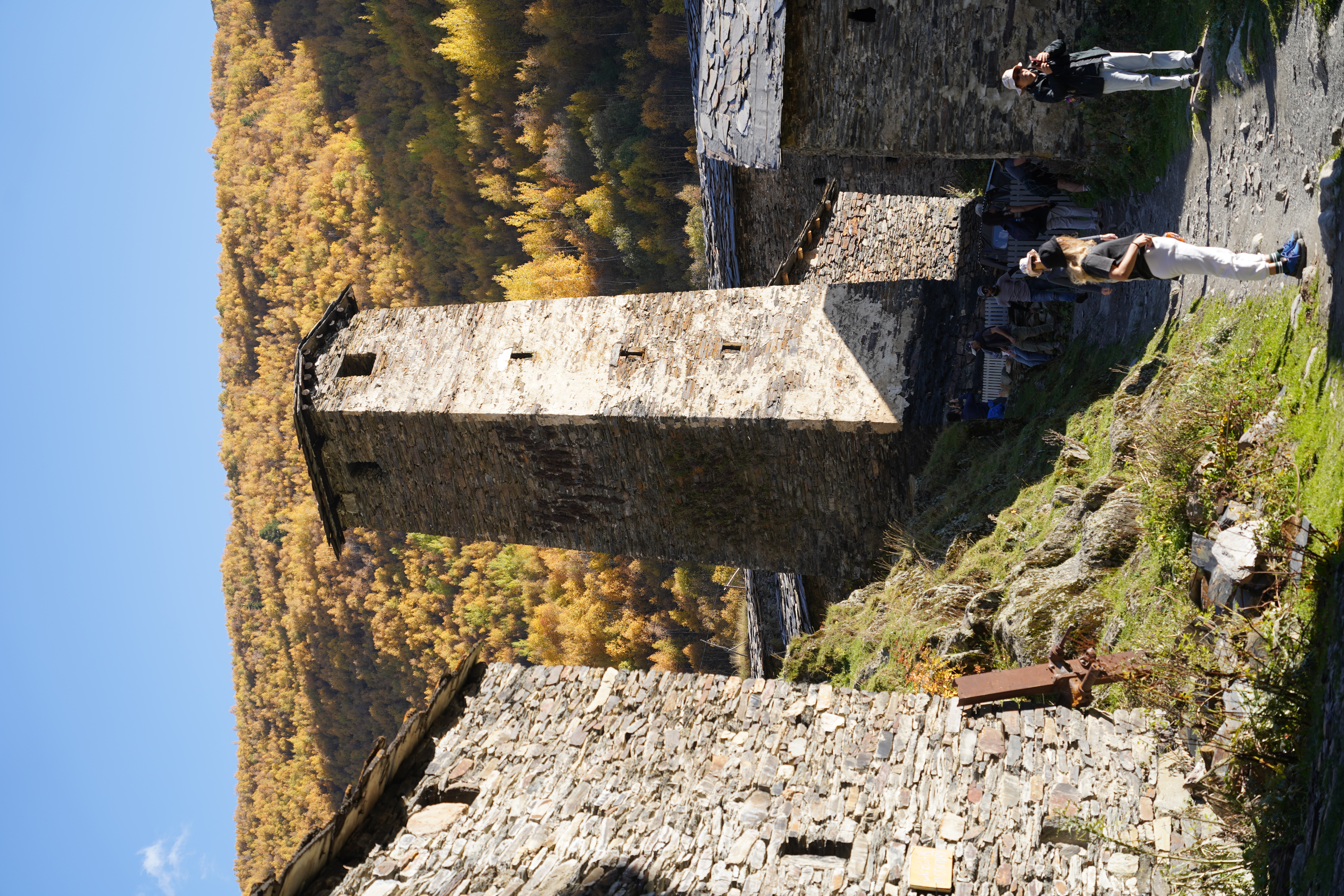 离开姆茨赫塔,我们沿着著名的军事大道向卡兹别克进发。这条路本身就是一个景观长廊。山路盘旋,一侧是深谷,一侧是峭壁。秋天的色彩在这里得到了极致的展现,漫山遍野的金黄与墨绿交织,像一幅巨大的油画。途中我们经过了阿纳努里要塞,古老的城墙和钟楼矗立在湛蓝的湖边,景色如明信片一般。