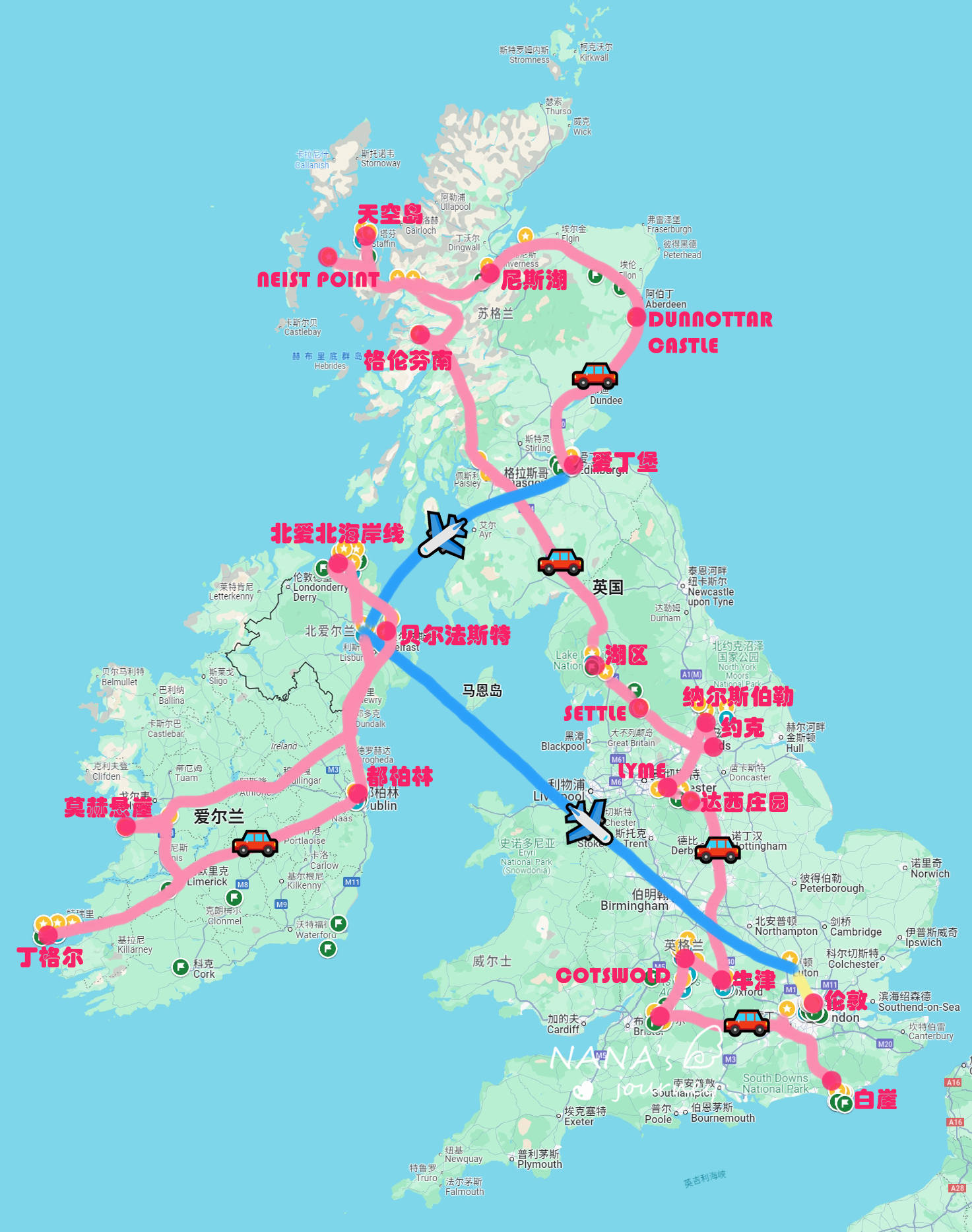 这就是全程线路图哦,粉色是自驾路线,蓝色是飞的部分。英国说大挺大,说不大也不大,我一个人开车,每天也就是早八最多晚八,其实最大问题是天黑的晚想争取更多时间看风景,可能回的比较晚了!自驾的攻略太多太复杂,会在攻略部分说哦~我这样的安排基本就是不走回头路了!