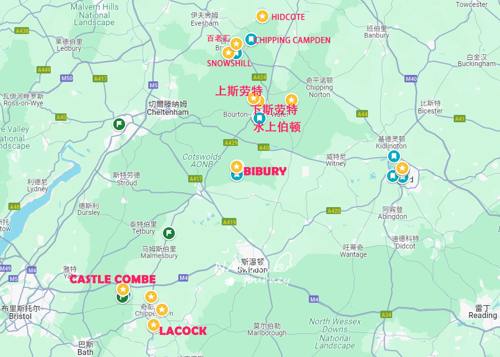 不过相信你也和我一样,在出发之前看了所谓的cotswold根本云里雾里不知道在哪,经过我实战后,我还是做了下地图,标注了我去过的这些小镇,当然这些都是按我喜好挑选的,大家也可以参考下~镇子或村落之间最远也就40来分钟的车程~