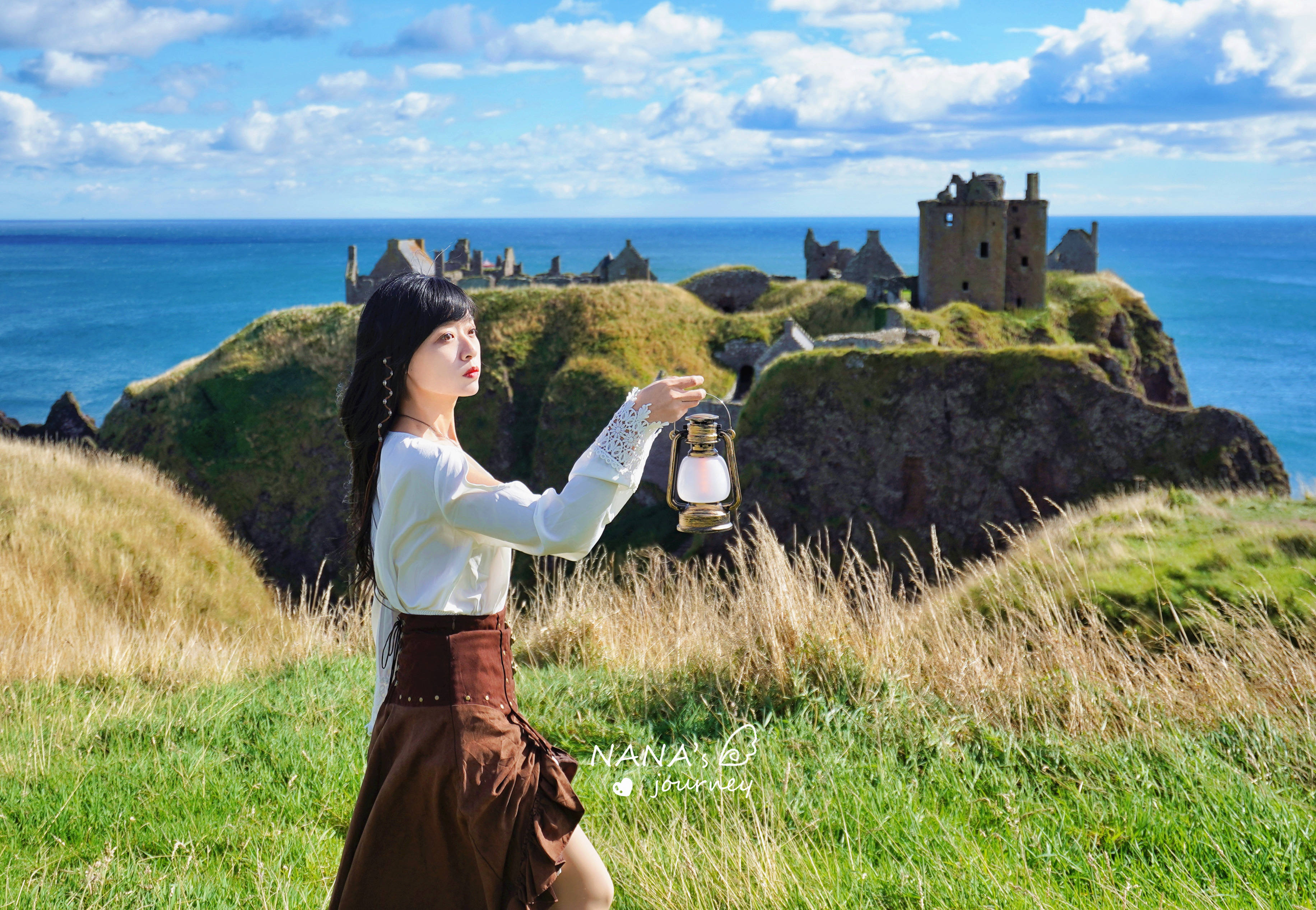 站在草地,迎风而立,仿佛拥抱了整片白崖。
