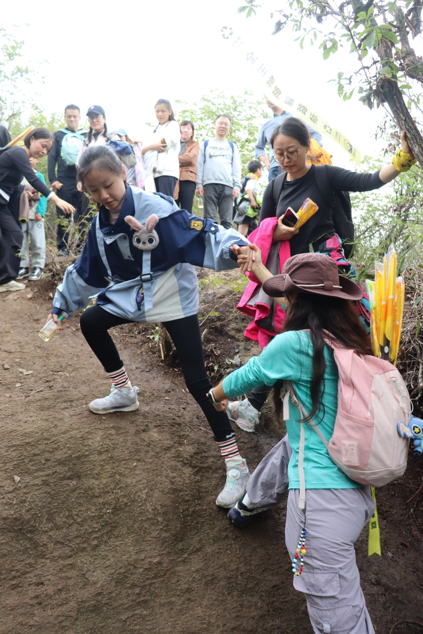 午后十二点,南北湖徒步正式开启。路线丰富多变,规整的台阶路、野趣的土路交替出现。孩子们手牵手互相鼓劲,小小的身影在山林间穿梭。