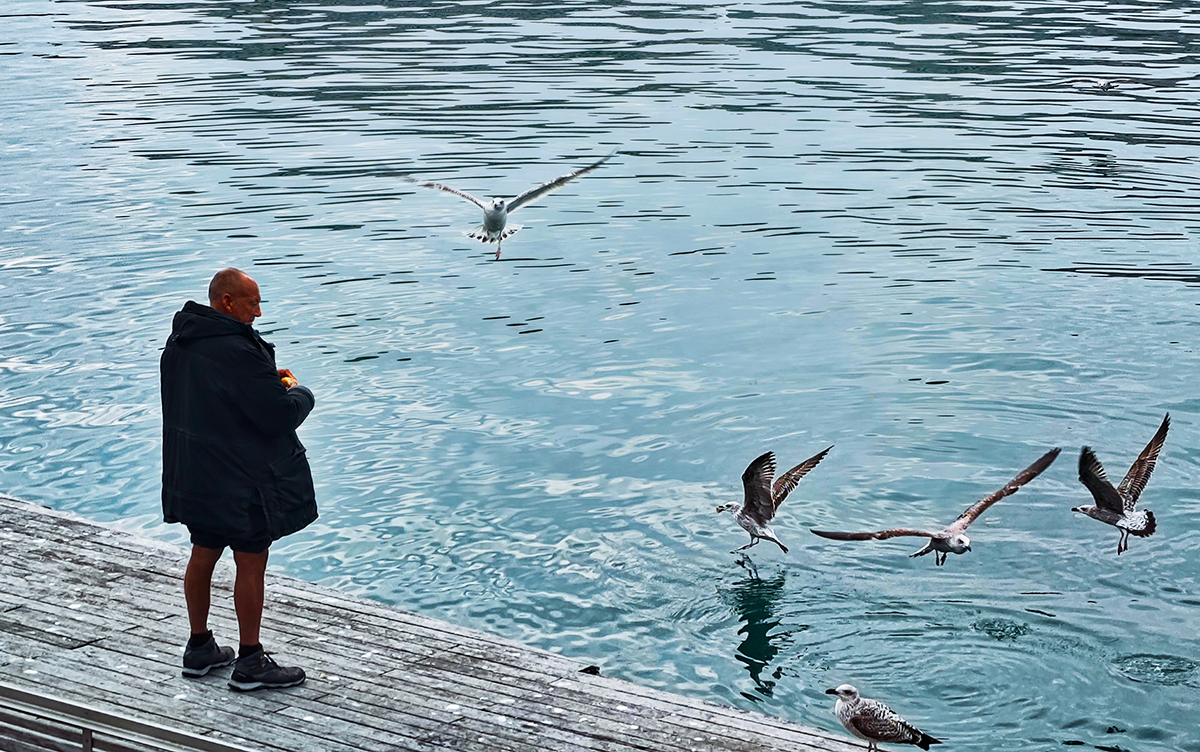 这边,一位慈善的老人在忙着喂海鸥啦……