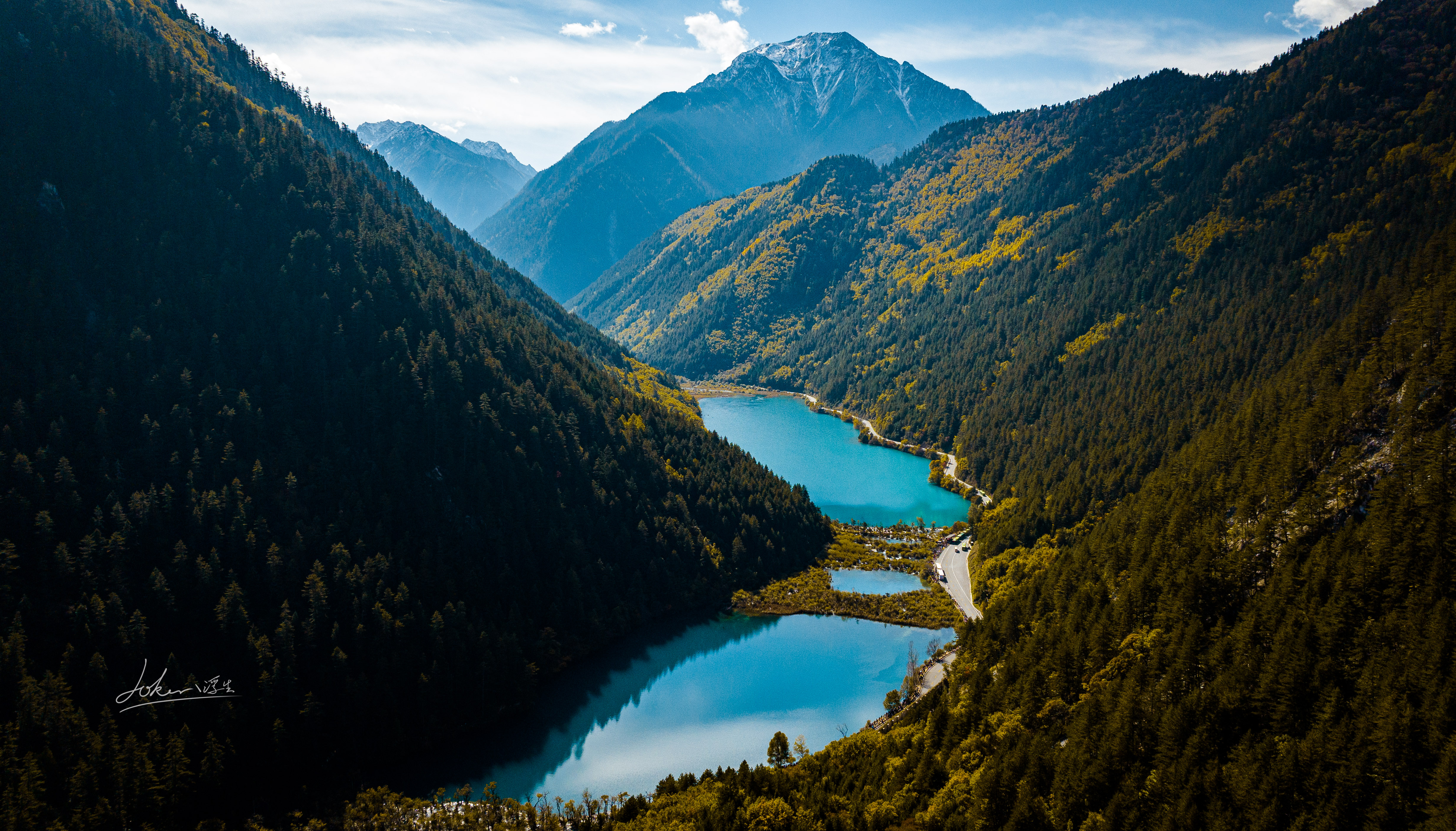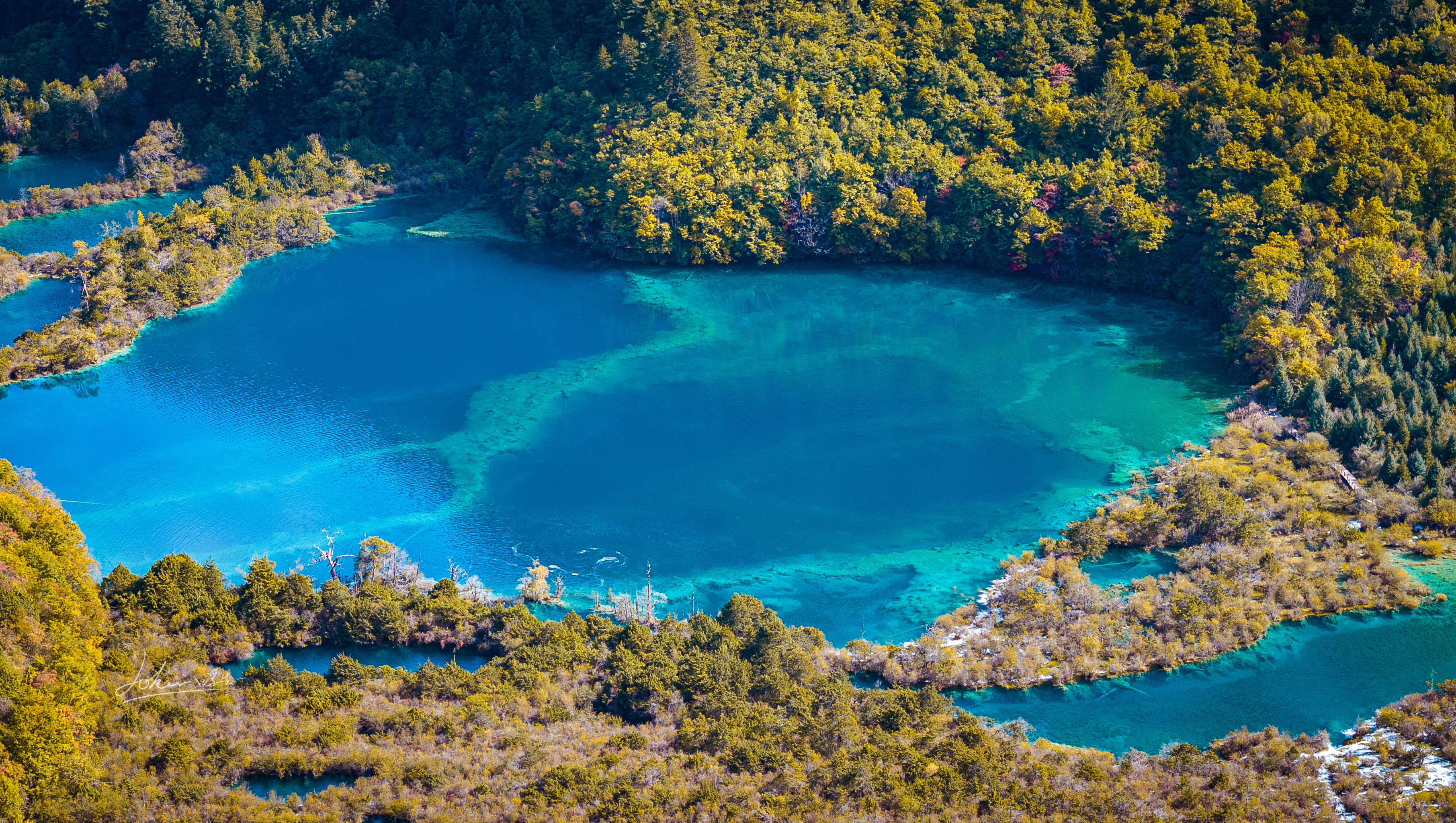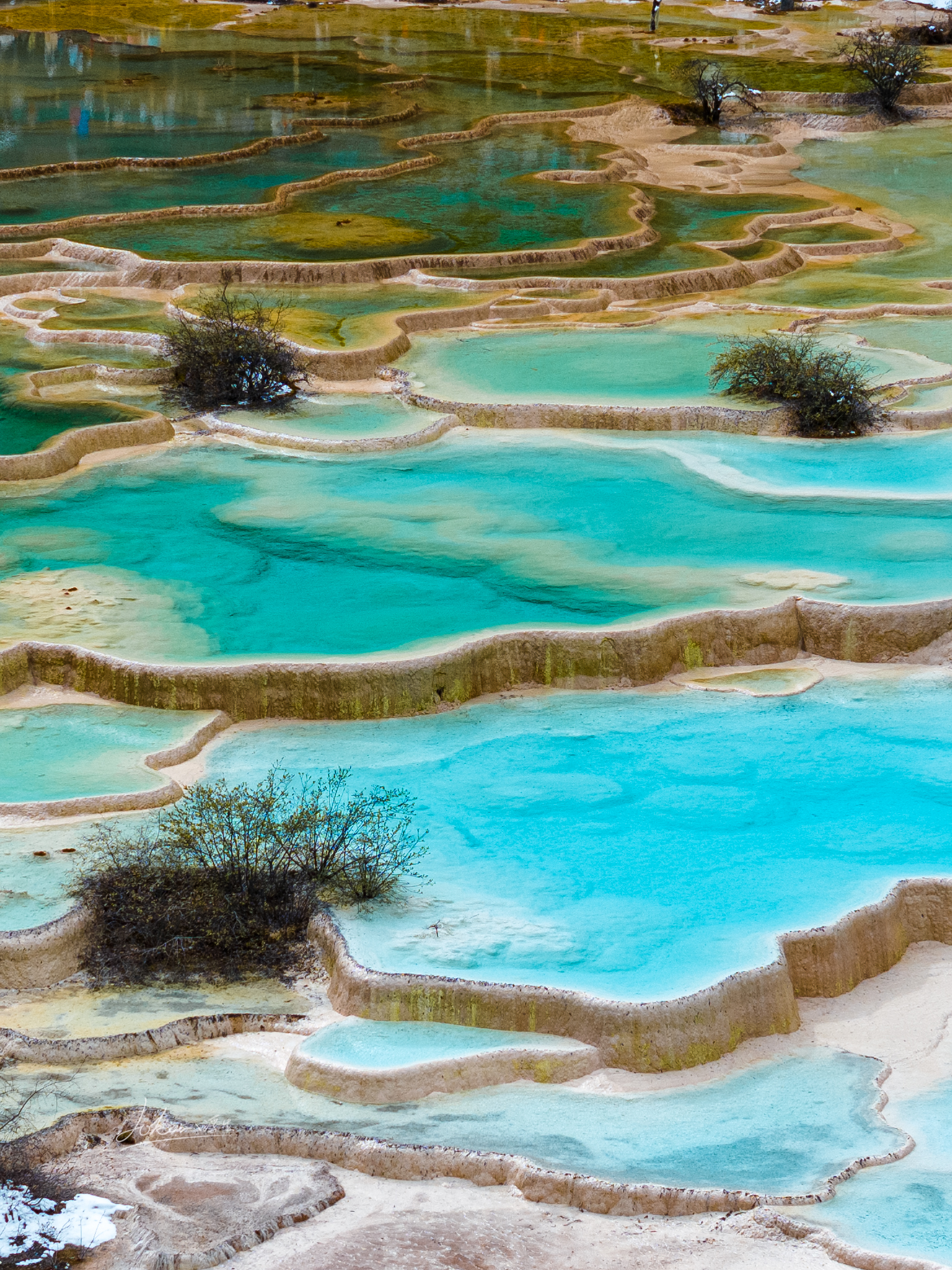 黄龙是中国唯一保护完好的高原湿地。它在一条由南向北逐渐隆起的山脊上,位于四川省阿坝藏族羌族自治州松潘县的一处著名自然景观。从高空俯瞰,长达1300米的天然钙化滩,像极了神话中的金色长龙。5000余个由流水中的碳酸钙沉淀堆积而成的钙化彩池呈梯田状排列,规模宏大,在阳光的照射下五彩缤纷,其中,海拔3576米的五彩池是黄龙规模最大的彩池群,池水澄澈如玉,色彩斑斓,所以黄龙,也有“人间瑶池”的美誉,而我们此行竟然幸运的遇见雪中的黄龙,漫天大雪纷飞的场景唯美极了。