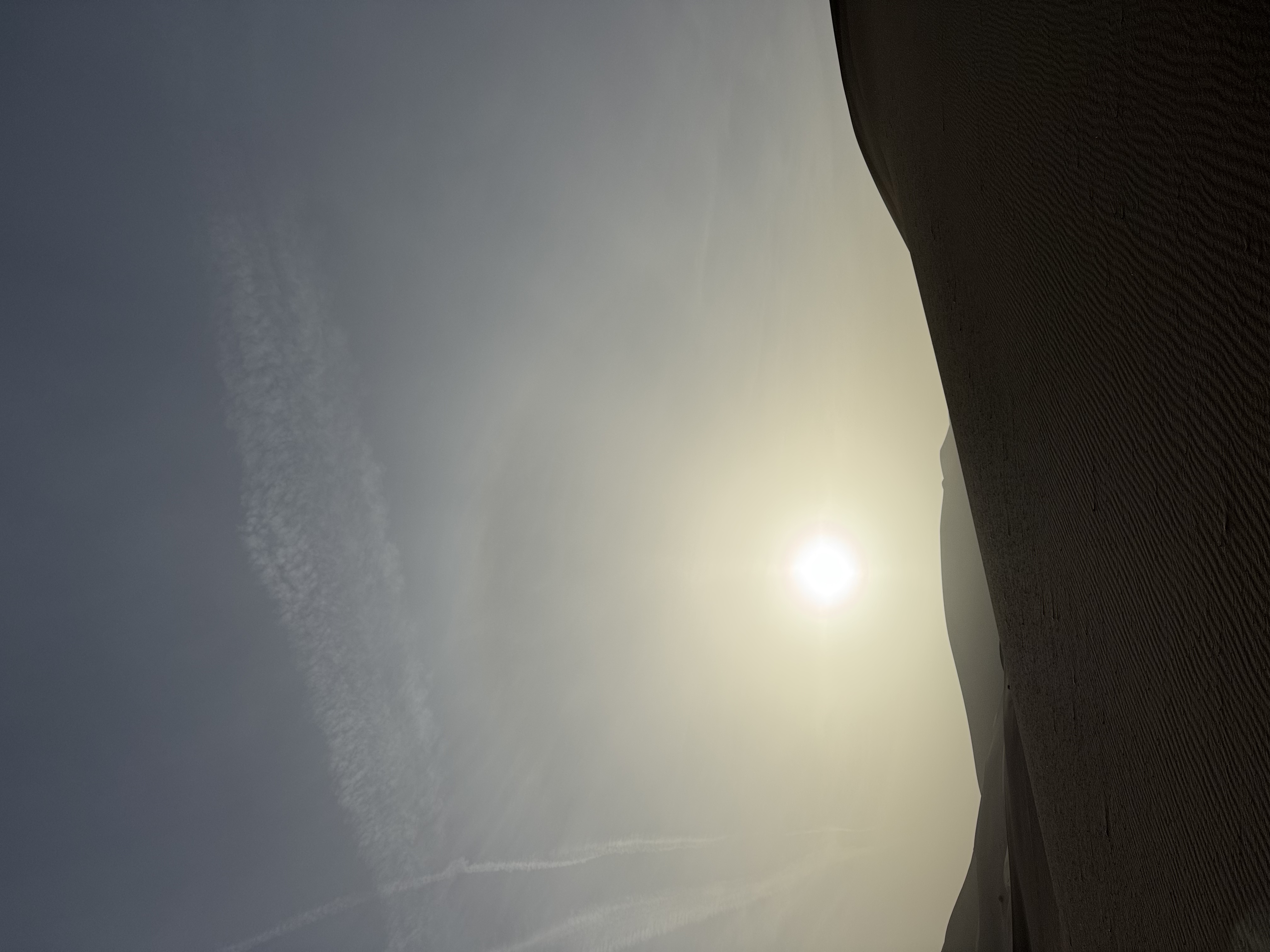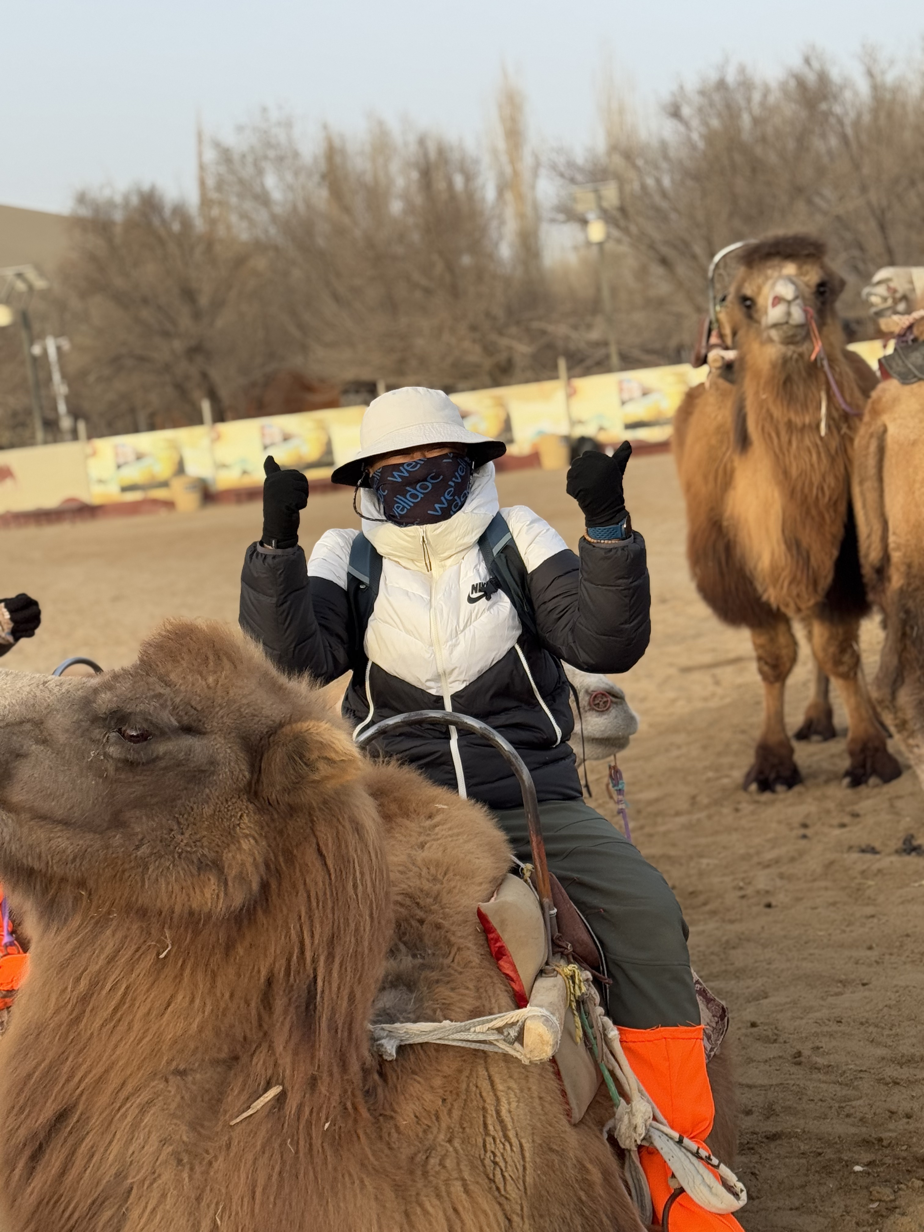 天空已没有了昨日的昏黄,太阳升起的时候,我已经面向鸣沙山的大门。仰望沙丘高耸,似乎已经听到驼铃在叮咚作响。这里的沙很特别,据说是中空的,八级以上的大风刮起时,沙是向上飞起的,且会发出风鸣声。今天没有风,有的是我坐在驼峰上惬意的向沙漠漫步。一行五人的驼队缓慢前进。领路的大姐一会唱起不知名的民歌,一会又叽叽喳喳的说着我听不懂的方言。这里的骆驼高大健硕,驼峰挺拔,性格却很温顺,把手埋进毛发里就像一个大号的暖手宝,正好抵御冬季的寒冷。
