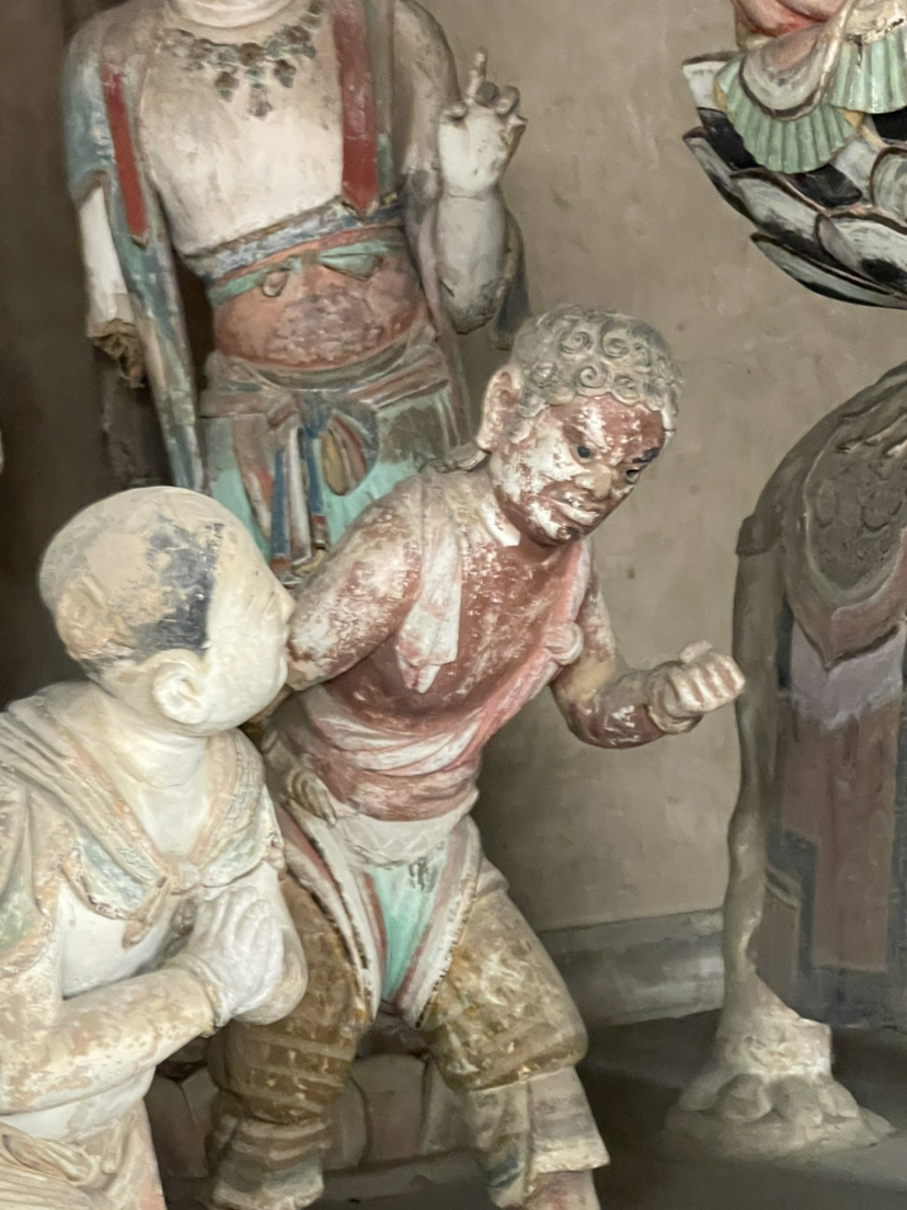 南禅寺与佛光寺的塑像都具有唐代的风格特征:面如满月、颈短肩宽、衣纹垂坠、额点红痣。人物表情自然,动作松弛,如天王含笑、童子嬉戏,在唐代塑像中,我们看不到任何当代寺庙中那些佛像与菩萨呈现的刻板不苟言笑的形象,却在庄严中透出人间烟火气,可谓是“唐代雕塑中的田园诗”。最有意思的是佛光寺中的一尊塑像具有卷发、深肤色、宽鼻厚唇的人种特征。很多人说是唐朝时期的昆仑奴,这个是供养人的随从还是佛教中的什么人物,还是留给读者去解读吧。