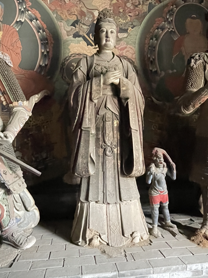 晋祠最值得一看的地方,除了圣母殿那与众不同的盘龙柱子,殿内的仕女群像真是让人拍案叫绝,主像为邑姜,两侧侍女、宦官、乐伎塑像与正常人的身高一样,每个人的神态表情却似乎在讲一个宫廷故事。看吧,圣母发话了。说的什么呢?侍女怀着一种紧张的表情中去聆听,却又不敢靠前。这些塑像虽然在山西,但呈现的是宋代的宫廷画面,与其同时代的作品,在南方只能在苏州的紫禁庵里找到了类似的表现手法,他们都是把人物形象塑造的极其生动,却又把一个故事画面融入了其中。