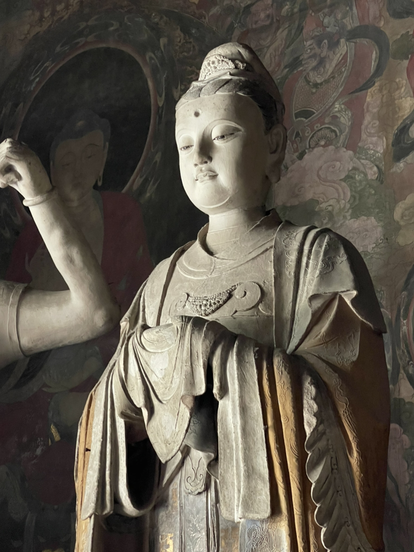 在华严寺,最值得一看的应该就是薄伽教藏殿了,这座建于辽大的大殿及其塑像保存至今,殿内保存了31尊辽代彩塑,包括佛、菩萨、弟子、胁侍等,神态生动,衣饰华美,尤其以那尊合掌露齿胁侍菩萨,身姿婀娜,面带微笑,被郭沫若誉为“东方维纳斯”。她微微启唇、眼波流转,仿佛刚从千年前的香火中醒来,与你对视。这就是“一眼千年”最动人的具象。