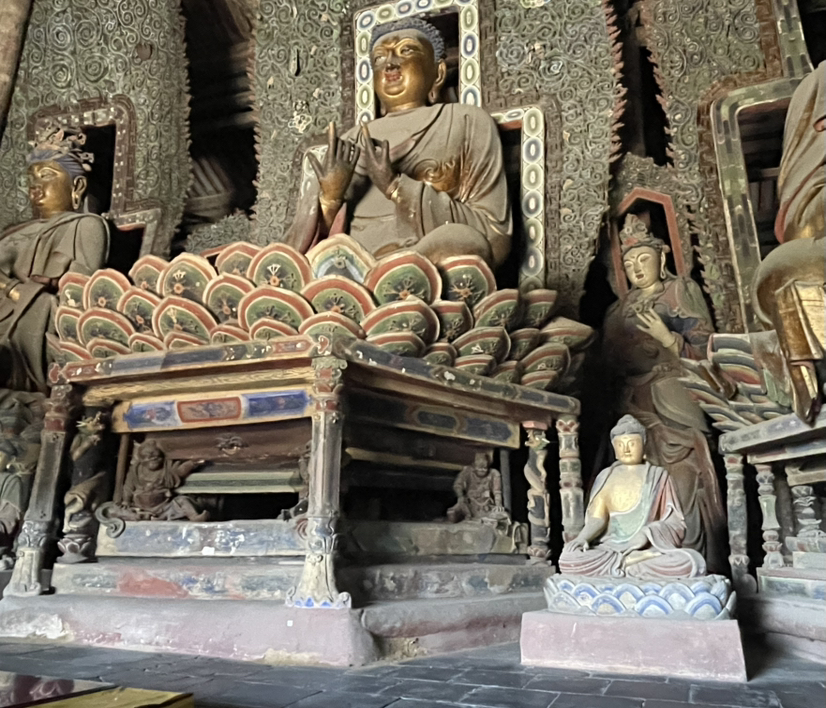第五日,参观应县佛宫寺与净土寺。佛宫寺是少有的以塔为中心构造寺院的庙宇。在中国隋唐以后的寺院建筑布局中,大多是中规中矩的中轴线布局。而佛宫寺的大殿却是显得分外的渺小,也正是这份渺小,才衬托出了应县木塔的那份宏伟与壮观,木塔不仅仅在建筑上通过木构的榫卯结构搭起来屹立千年不倒,而且每层的佛像都及其精美。只可惜目前无法登临,只能在第一层瞻仰下佛祖的慈悲。
