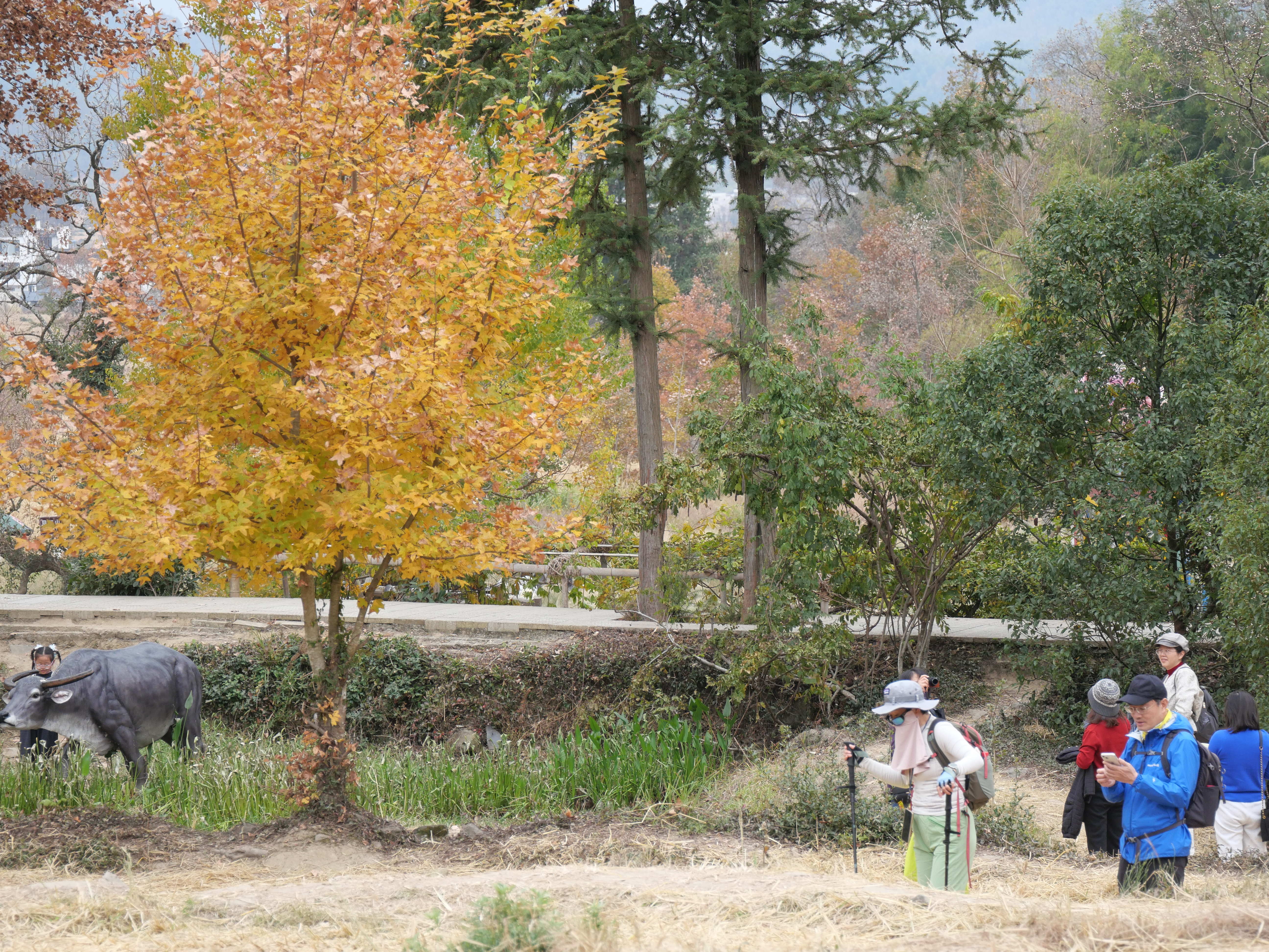 乘车抵达协里,徒步之旅由此启程,一路向塔川景区行进。塔川的秋日景致成为镜头焦点,定格下自然与村落交融的画面后,一行人沿金黄稻田步道折返宏村,沿途稻香伴行,步履轻快。